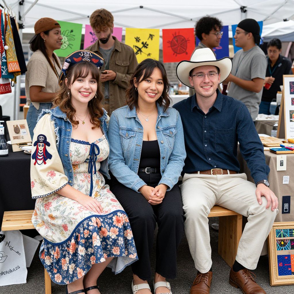 A diverse group of friends gathered at a weekend market, each wearing a nice casual outfit with a unique costume twist—a woman in a floral dress with a vintage pirate motif on the sleeves and a denim jacket, a man with a modern cowboy hat and chinos, all smiling, sitting on a wooden bench with colorful banners and handmade items around them. The woman has big breasts and cute face