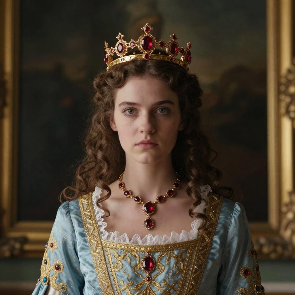 Photograph of a young Caucasian girl with long blonde hair, fair skin, and blue eyes, smiling gently. She wears a Renaissance-style jester hat with white and dark blue fabric, adorned with gold trim and a white pom-pom. Her dress is dark green with intricate gold patterns and puffed sleeves, featuring lace trim and large red gemstone brooches at the neck and chest. The background is a dark, muted gradient, drawing focus to the girl. The lighting is soft, highlighting her face and attire.