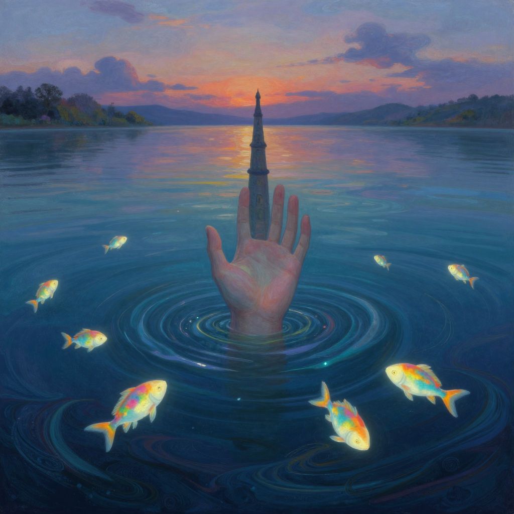 Digital art: A hand emerges from a blue lake at sunset, surrounded by glowing fish, with a spire reflected in the water.