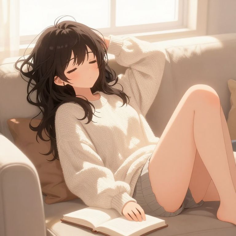 Anime girl lazy day, lounging on a cozy couch with messy hair, oversized sweater, soft pastel colors and sunlight streaming through a window, warm and relaxed atmosphere
