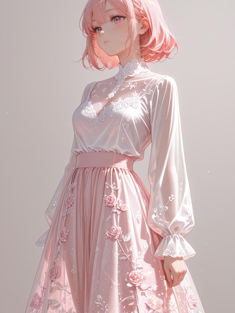 1girl, realistic face, Sheer mesh blouse, delicate floral embroidery, soft pastel pink, long sleeves, high neckline, matching sheer mesh skirt, layered ruffles, knee-length, lightweight fabric, elegant and romantic.