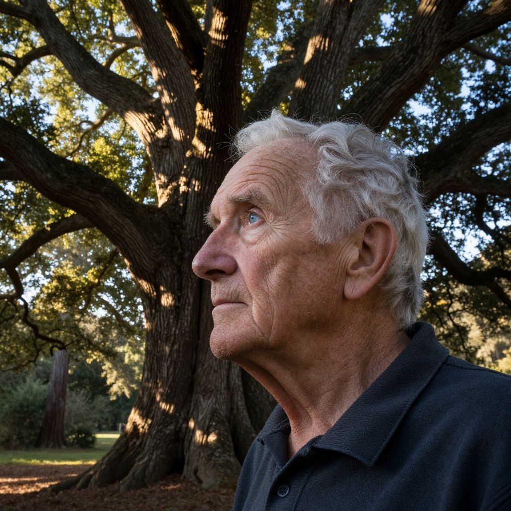 Photograph of an elderly white man with curly white hair and deep wrinkles, wearing a black polo shirt, standing in profile against a large, sunlit oak tree with thick, twisting branches. His blue eyes gaze thoughtfully into the distance. The background features a sun-dappled forest floor with scattered leaves and greenery. The image highlights the contrast between the man's weathered skin and the vibrant, textured bark of the tree. The lighting creates a serene, contemplative mood.