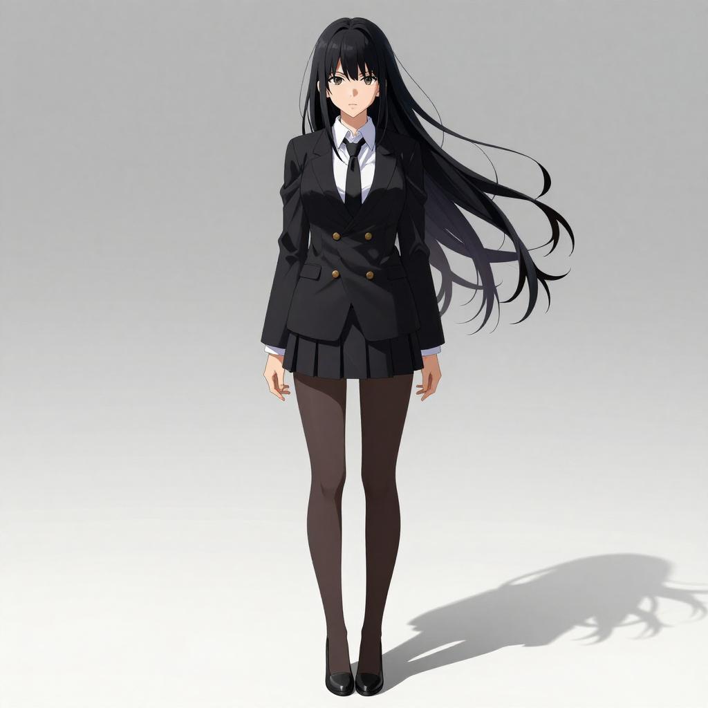 Digital anime-style drawing of a young woman with long, flowing black hair and fair skin. She wears a black double-breasted school blazer with gold buttons, a white shirt, black tie, and a short black pleated skirt. She also has black pantyhose and black shoes. Her expression is neutral, and she stands against a simple gradient background that transitions from light gray at the top to white at the bottom. Her shadow is cast on the ground to her left. The image focuses on her from head to toe, with no additional objects or people in the background.