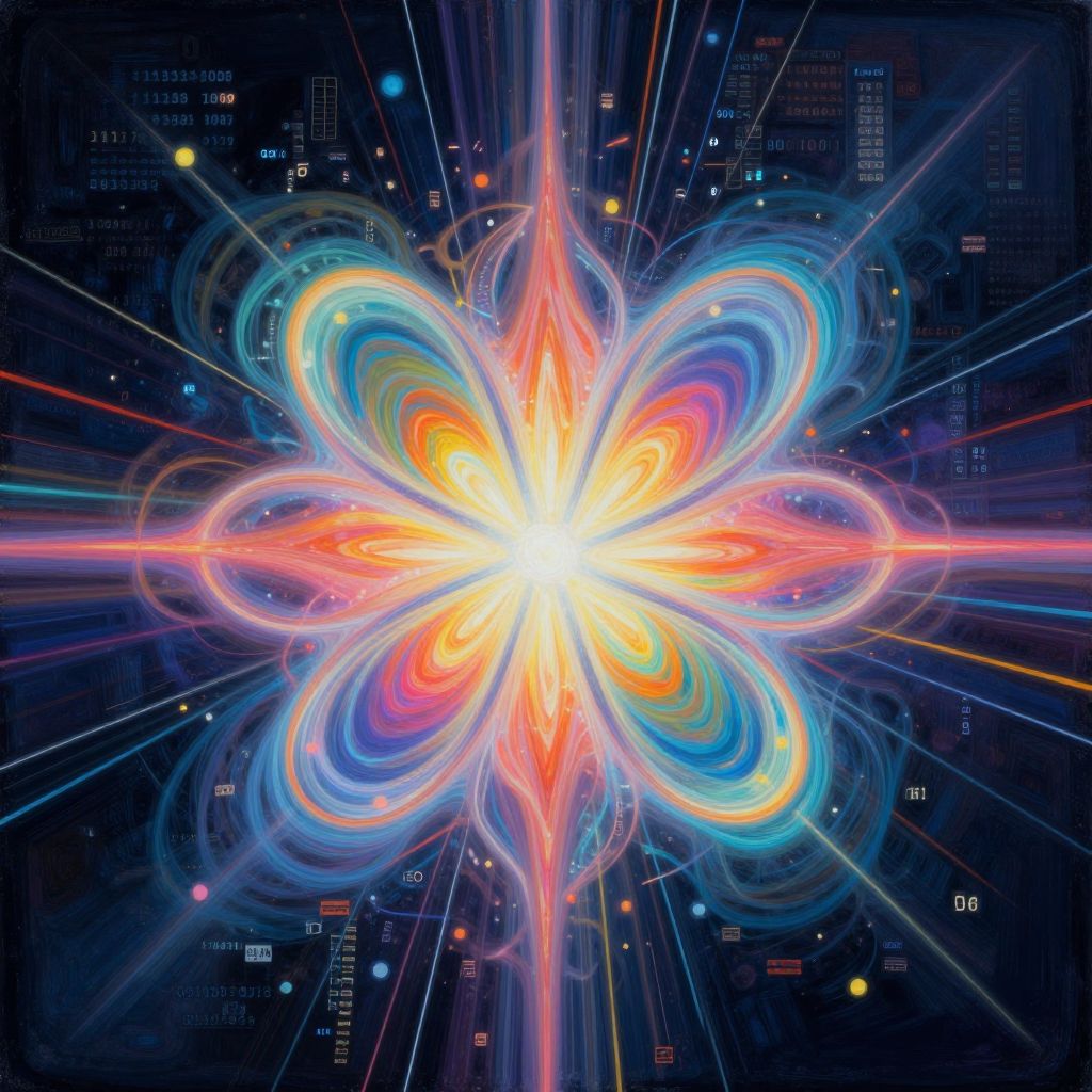Digital artwork of a vibrant, glowing, symmetrical flower-like pattern with colorful, swirling light trails on a dark, tech-filled background.