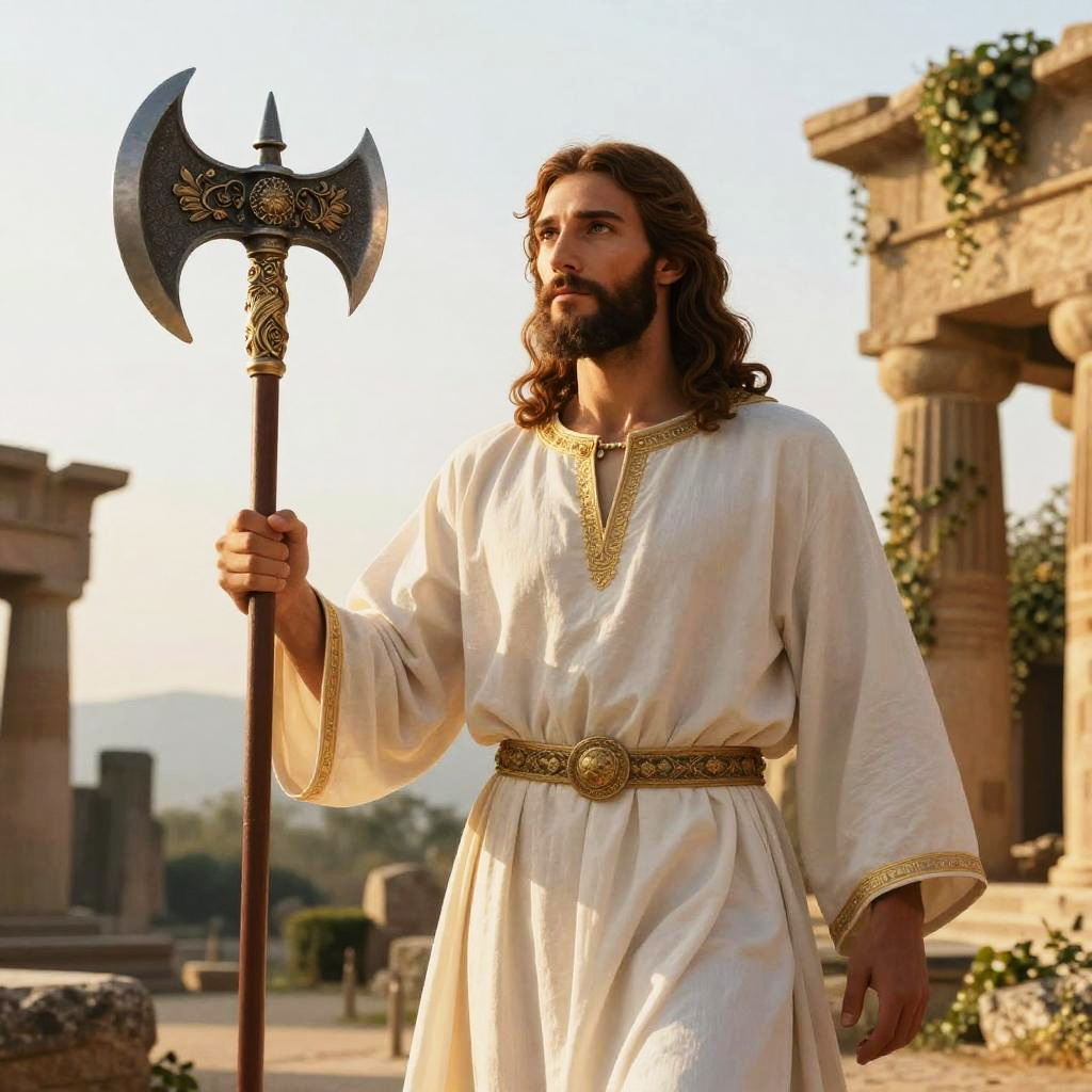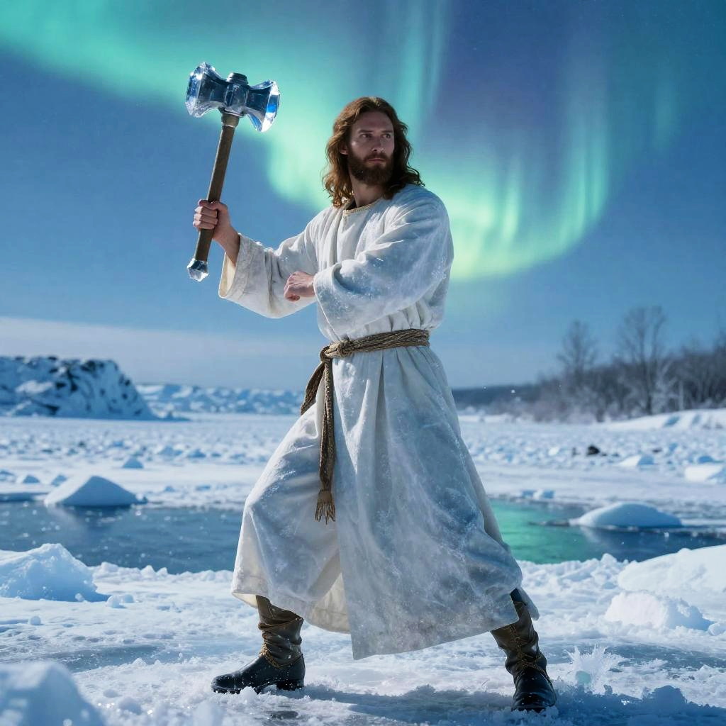 Jesus holding a grenade in a playful pose, with colorful lighting. The background includes vibrant street art and lively patterns. Focus on a whimsical mood.