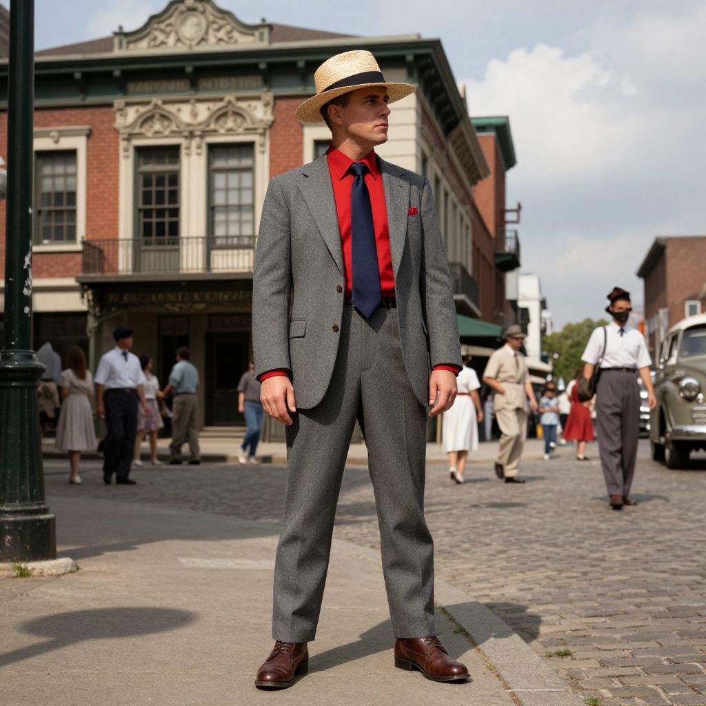 A man in a well-tailored grey suit with a vibrant red shirt and a dark blue tie stands confidently on a bustling city street. He wears brown leather boots and a classic straw hat tilted slightly to one side, adding a touch of vintage charm. The scene is set in a mid-20th century urban environment, with a historic building in the background featuring ornate windows and a red-brick façade. The sunlight filters through the clouds, casting soft shadows and highlighting the details of his outfit and the street's cobblestones. The atmosphere is lively yet timeless, blending nostalgia with a sense of quiet authority.