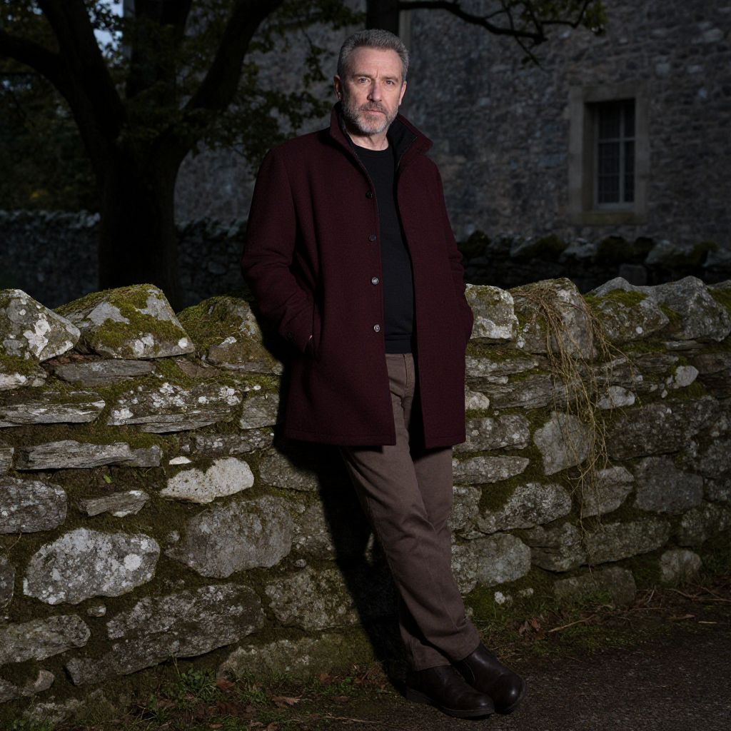 A photograph of a middle-aged man with short gray hair and a beard, wearing a dark red coat over a black shirt and brown pants. He's standing against a moss-covered stone wall in a dimly lit, outdoor setting with trees and a stone building in the background. The lighting casts a dramatic shadow, adding a moody atmosphere to the scene.