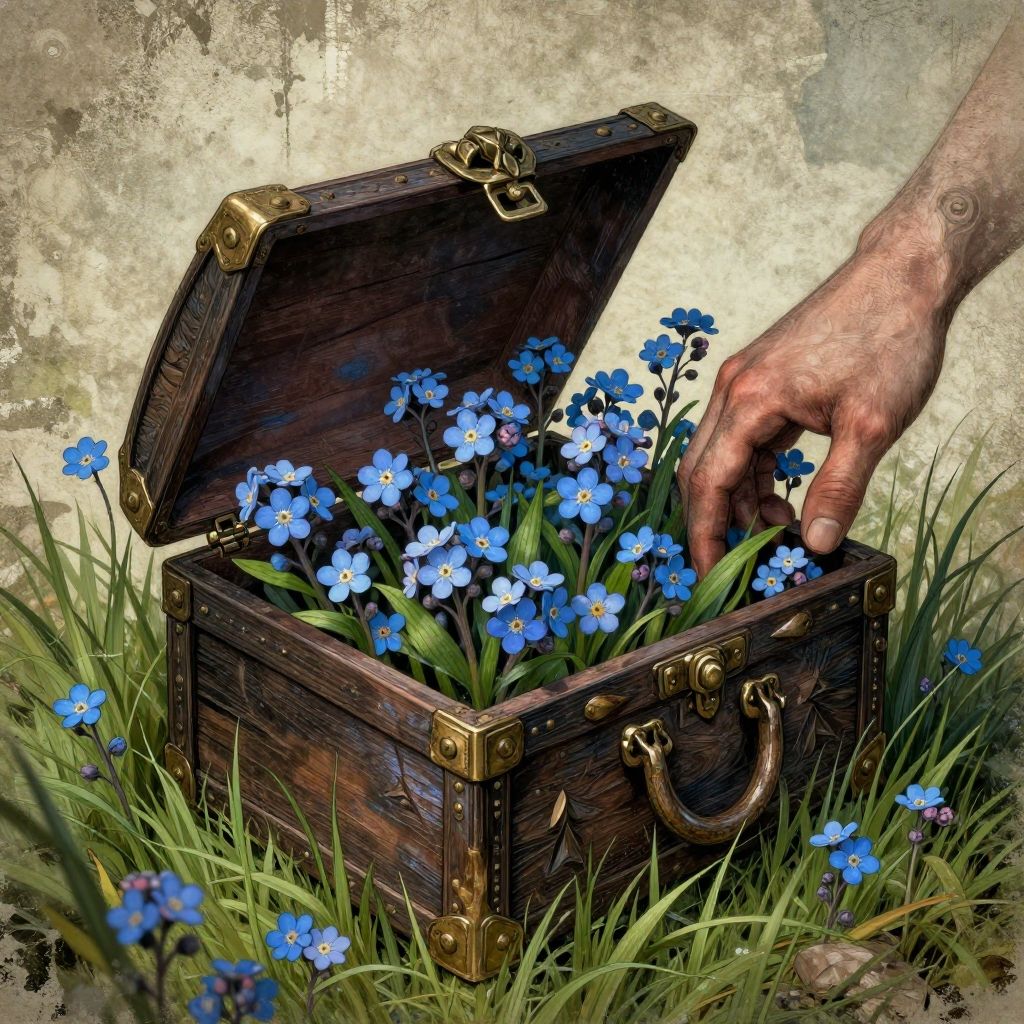Digital art: A wooden treasure chest filled with blue flowers, opened by a human hand, surrounded by grass in a textured, rustic background.