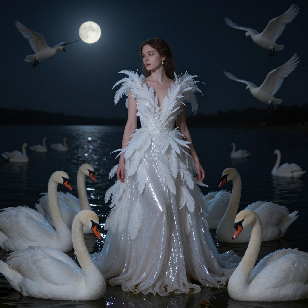 Photograph of a fair-skinned woman with wavy brown hair wearing a white, floor-length gown adorned with large, fluffy feathers and sequins, standing in a dark, moonlit lake. Surrounding her are six white swans with orange beaks, and three white birds in flight. The full moon is bright in the night sky, casting a reflection on the water. The woman's expression is serene, and the overall scene evokes a sense of ethereal beauty and elegance.