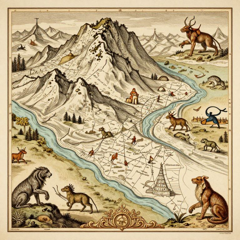 Illustrated map-style drawing of a mountainous landscape with winding river, featuring various animals like deer, elk, and wolves, and a small town with