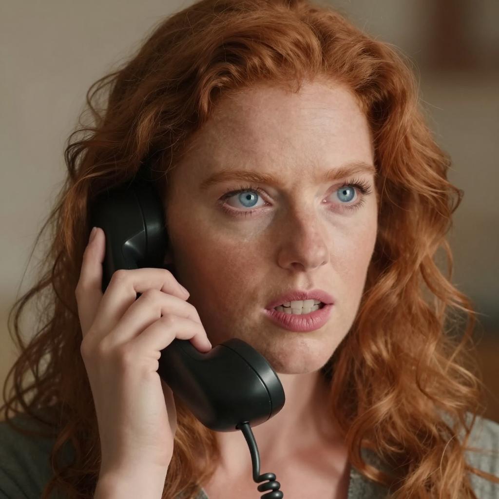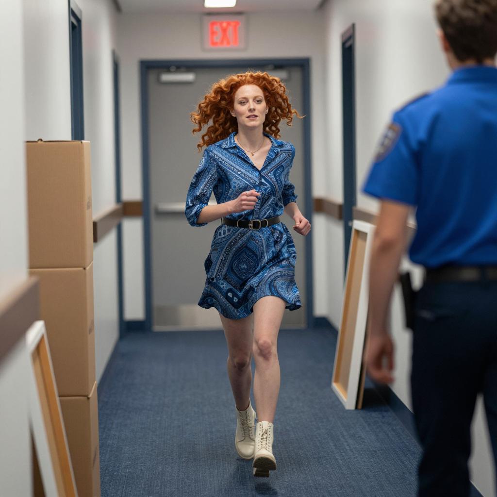 Woman with curly red hair, wearing blue patterned dress and white boots, running down a blue-carpeted hallway. Man in blue uniform on right, blurred. Cardboard boxes and frames on left and right. Red exit sign above.