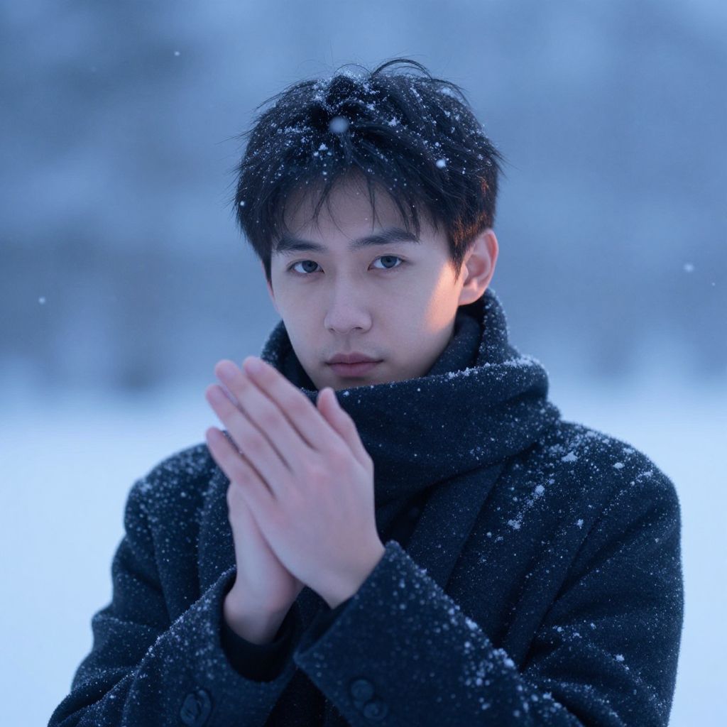 Photograph of an Asian man with short, black, slightly messy hair, standing in a snowy outdoor setting. He is wearing a black, thick, woolen coat with a high collar, hands clasped together in front of his chest. His skin is fair, and he has a neutral, slightly serious expression. Snowflakes are visible on his hair and coat. The background is blurred, with a mix of gray and white tones, suggesting a wintry forest or mountainous area. The lighting is soft, with a blue tint, enhancing the cold atmosphere.