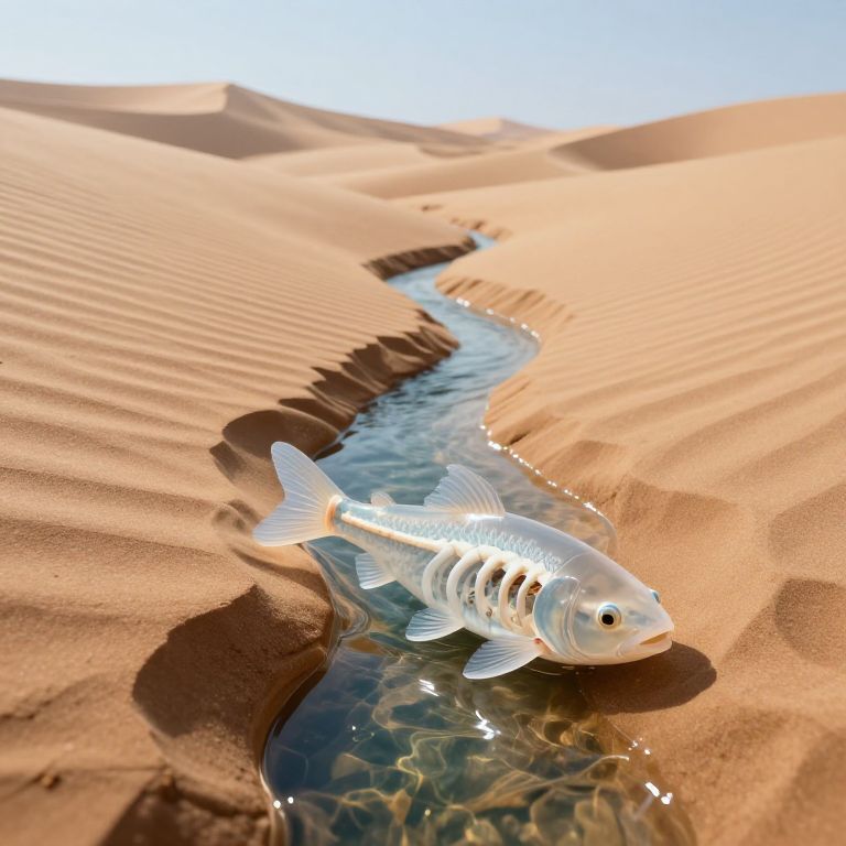 In a surreal desert landscape, translucent fish with exposed skeletal structures glide serenely through a narrow, tranquil stream that defies gravity by flowing uphill between towering sand dunes.