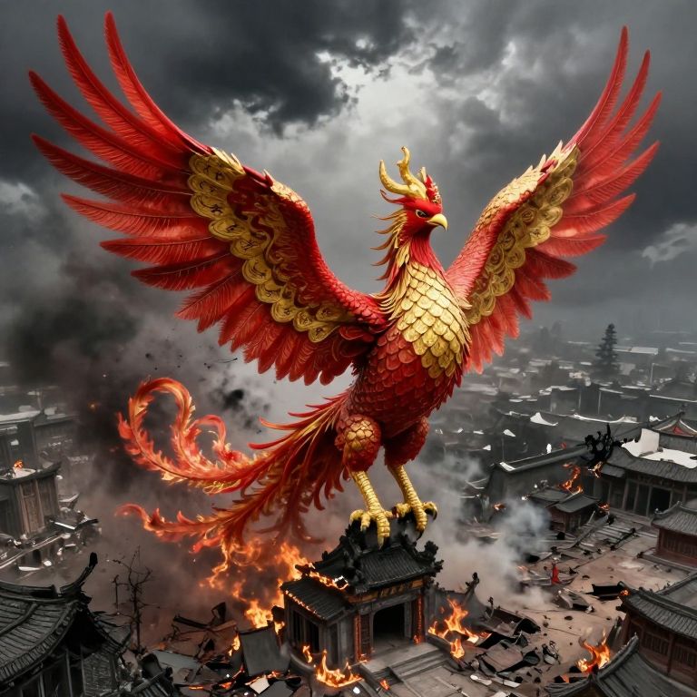 A regal mythical creature with scales reminiscent of ancient Chinese ink paintings gracefully ascends from the remains of a burning structure, set against a dramatic backdrop of stormy skies. As it unfurls its wings to unveil intricate patterns echoing traditional Chinese calligraphy, the scene transitions into an aerial perspective, highlighting the extensive destruction beneath and accentuating the awe-inspiring magnificence of this legendary being. The phoenix's radiant hues of red and gold starkly contrast against the scorched debris, invoking a sense of hope amidst ruin and underscoring the strength of resilience and rebirth in this captivating visual metaphor.