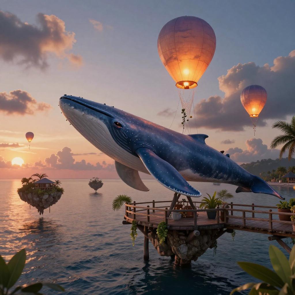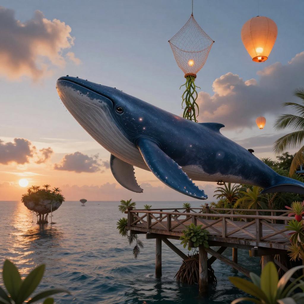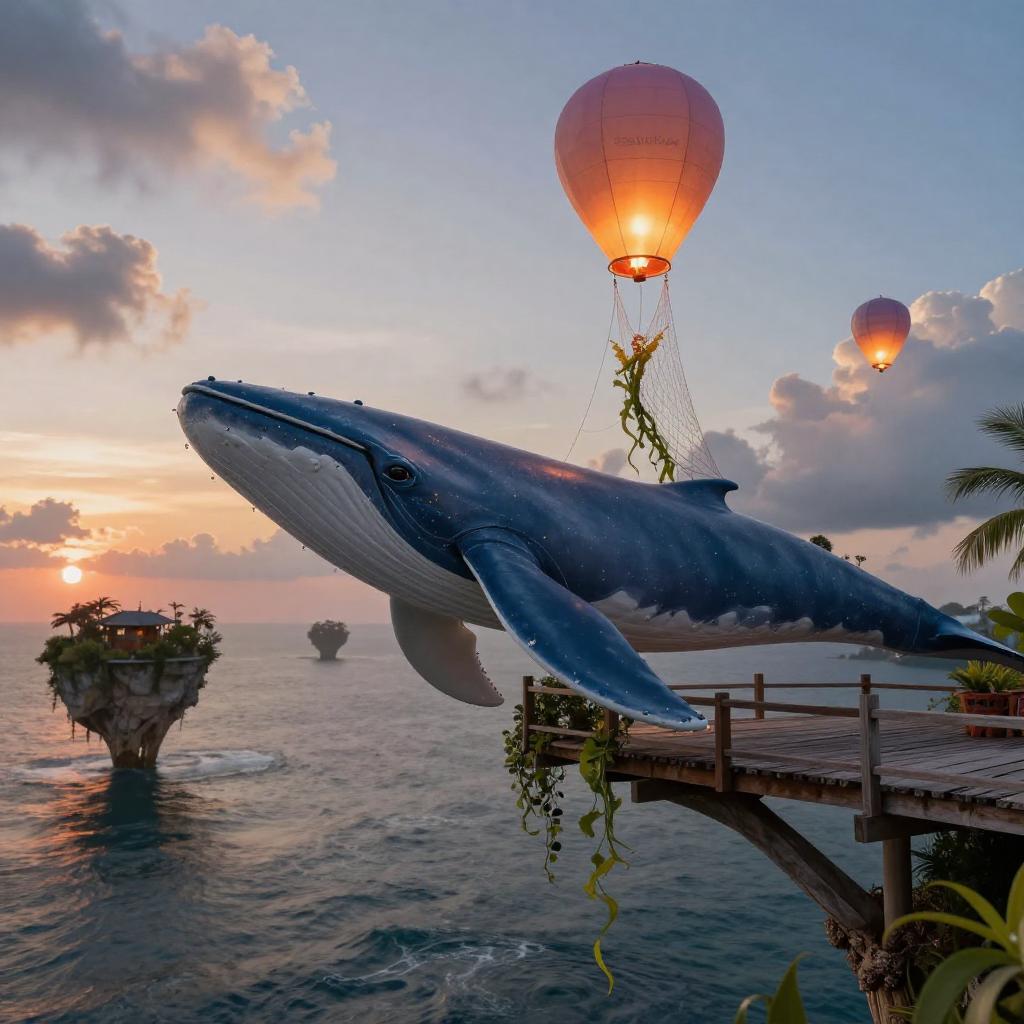 Sylvan skywhale mariner barnacled balloon-saddle, trailing kelp and lantern-netting perched in wind-bent mangrove balcony on a floating isle above a sunset sea of clouds with drifting islets and tethered sky-lanterns. Shot on Leica SL2-S with Summilux-C 50mm, hyperdetailed, 8K HDR, dramatic lighting, cinematic atmosphere.