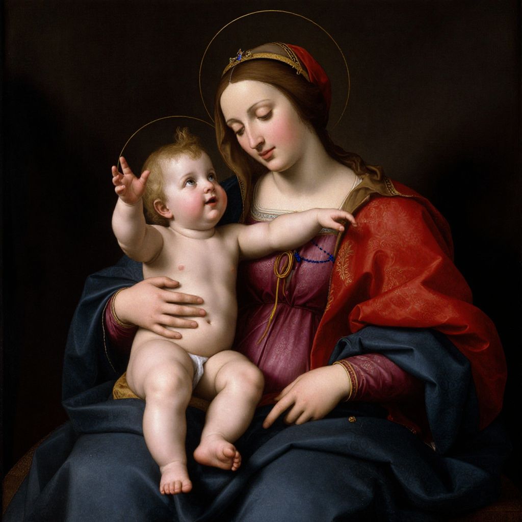 Madonna and Child depicted in a serene portrait, featuring a woman draped in a dark blue robe with a vibrant red mantle, cradling a nude infant who gestures upward, both adorned with golden halos and intricate details against a dark background.