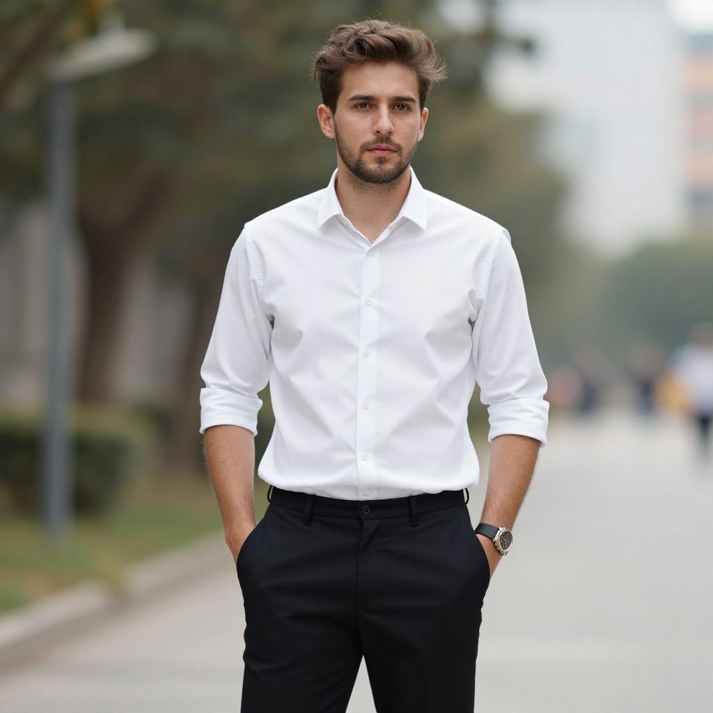 Photograph of a handsome, young Caucasian man standing on a blurred urban street. He has light brown, wavy hair and a short beard. He wears a crisp, white, long-sleeved button-up shirt with sleeves slightly rolled up and black pants with hands in pockets. A silver watch adorns his left wrist. The background shows a faintly visible sidewalk, trees, and indistinct buildings, suggesting a cityscape. The overall color palette is neutral with the white shirt contrasting against the black pants and blurred greenery. The man's serious expression and confident stance are prominent in the image.