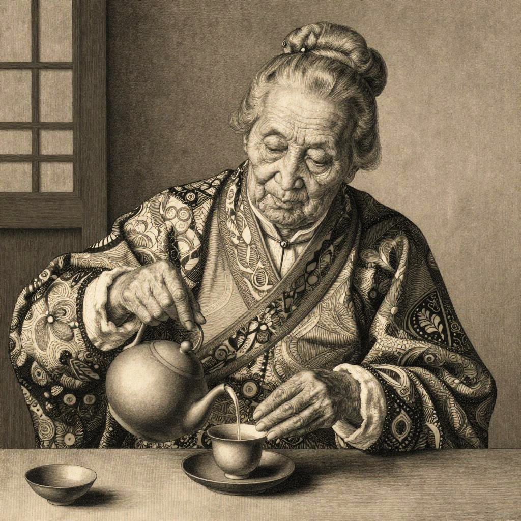 A captivating portrait of Elderly Tea Master in the style of Albrecht Dürer, showcasing her serene concentration, flourished hands mid-pour, and intricately patterned robes rendered with fine, engraved-like textures that reflect a lifetime of ritual against a softly shaded background.