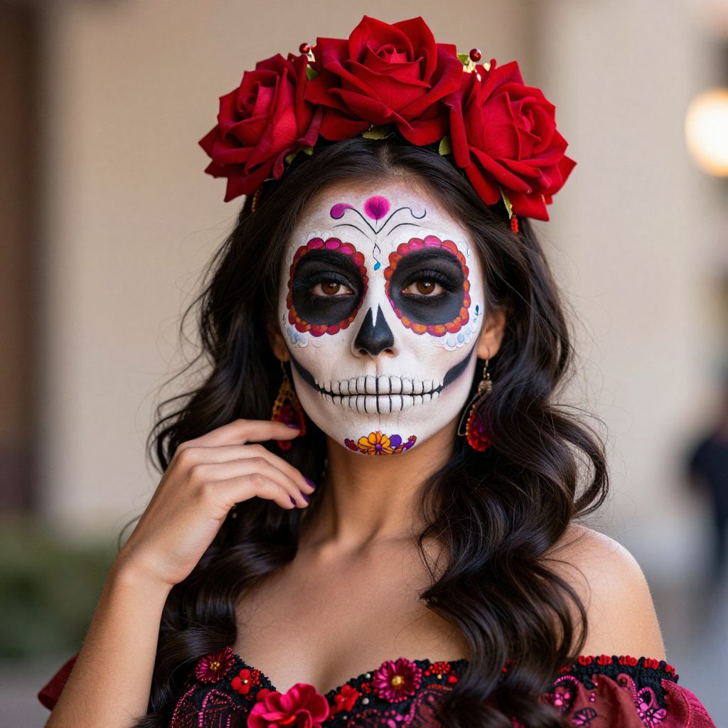 Woman adorned in vibrant Day of the Dead makeup and a floral crown, featuring intricate sugar skull designs and bold red roses, stands elegantly against a softly lit background, embodying the traditional Mexican celebration of Dia de los Muertos.