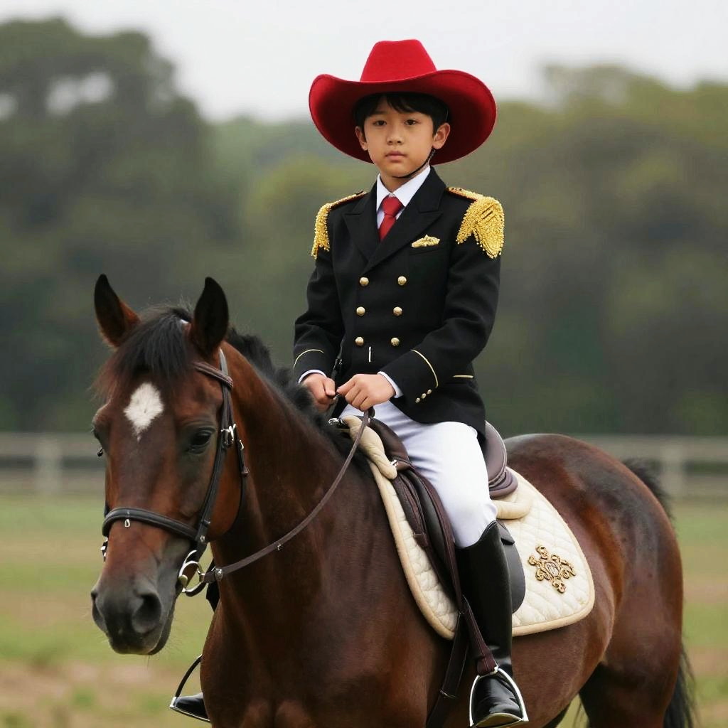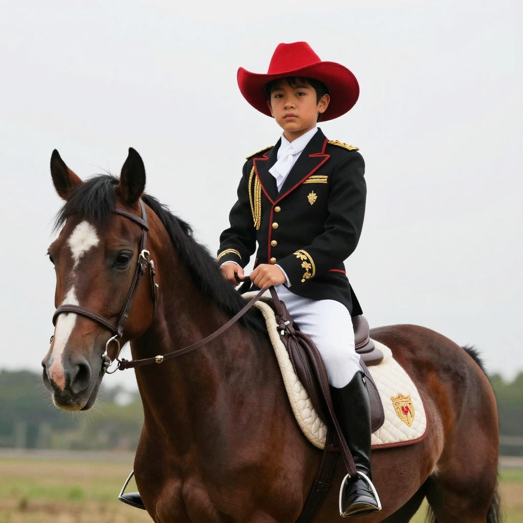 Matador, boy in a red hat and black and gold costume sitting on a horse