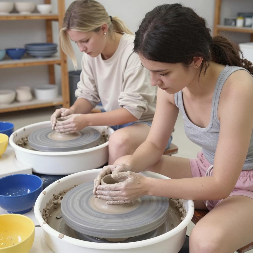 Photograph of two women in a pottery workshop. Woman in foreground with dark hair, wearing gray tank top and pink shorts, focused on shaping clay on a spinning potter's wheel. Second woman in background with blonde hair, wearing beige shirt, working on similar task. Multiple blue and yellow pottery bowls, wet clay, and tools on tables. Workshop setting with wooden shelves and pottery equipment in background. Women have hands and clothes covered in clay. Woman in foreground's face not visible. Casual, focused activity. Natural light.