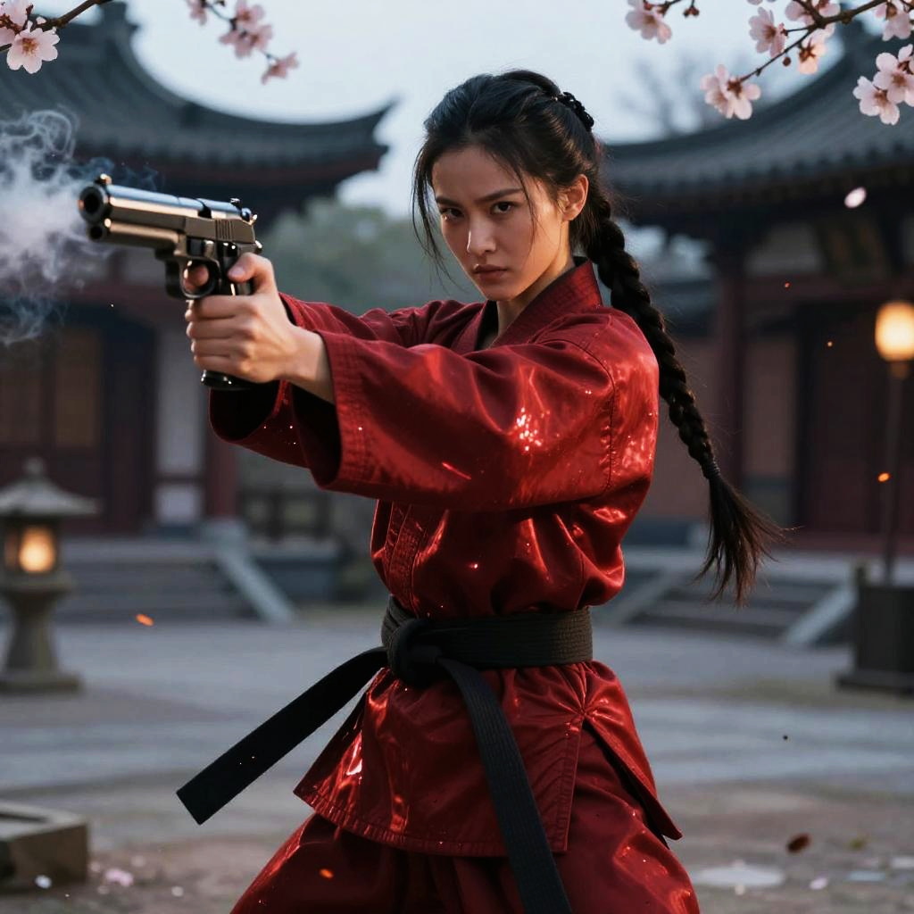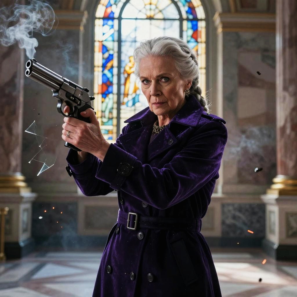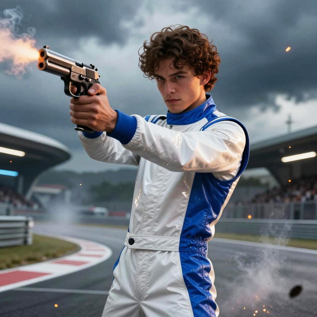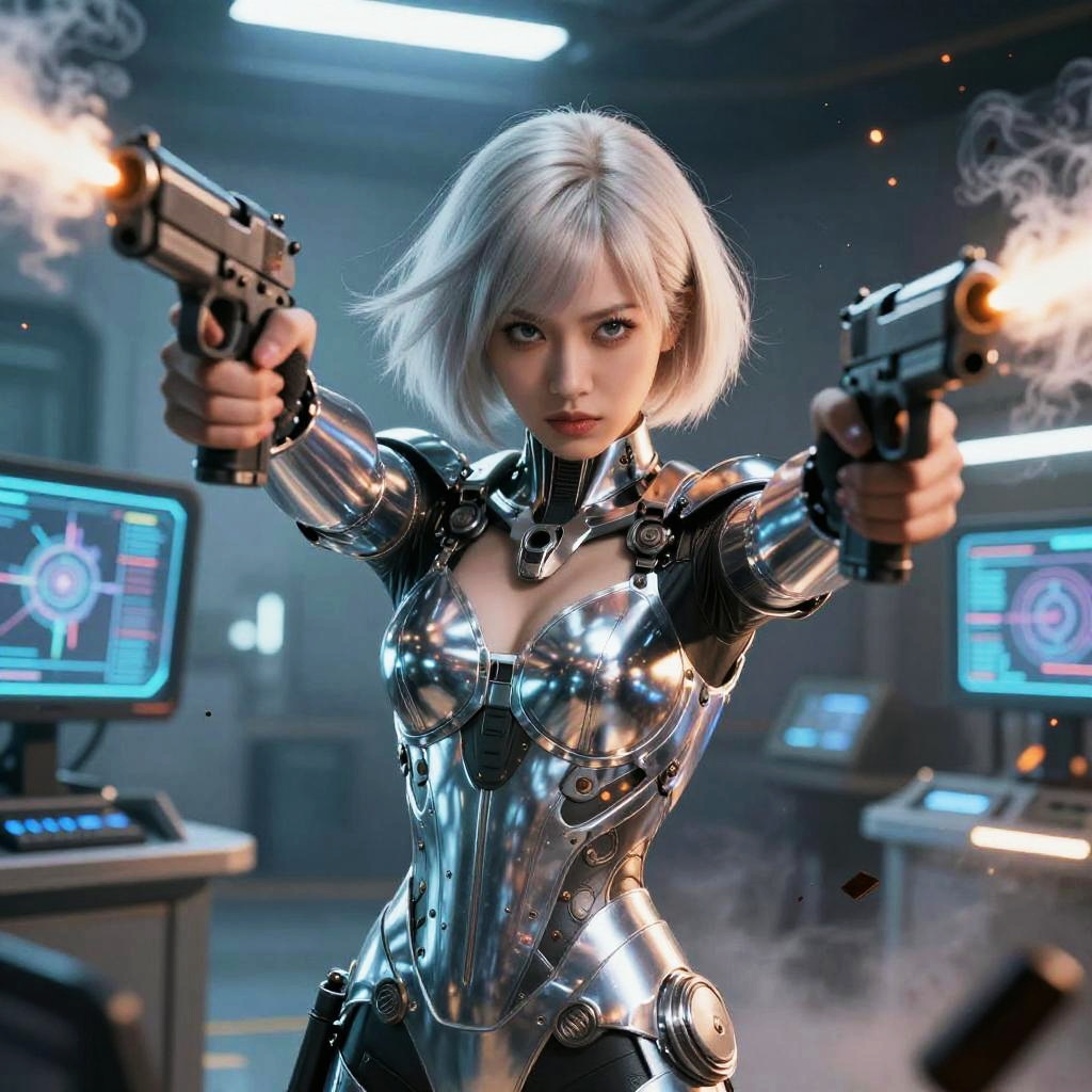 Photorealistic cinematic action still, SDXL: graceful young man with long golden hair tied back, wearing flowing white robes adorned with gold patterns, in ornate palace balcony overlooking sunlit cityscape. She locks eyes with the viewer, unwavering focus and power. Dual pistols raised, muzzle smoke, embers and flying debris. High detail, glossy highlights, skin pores, rim light, cool-warm contrast, volumetric fog, dynamic pose, crisp focus, dramatic tension.