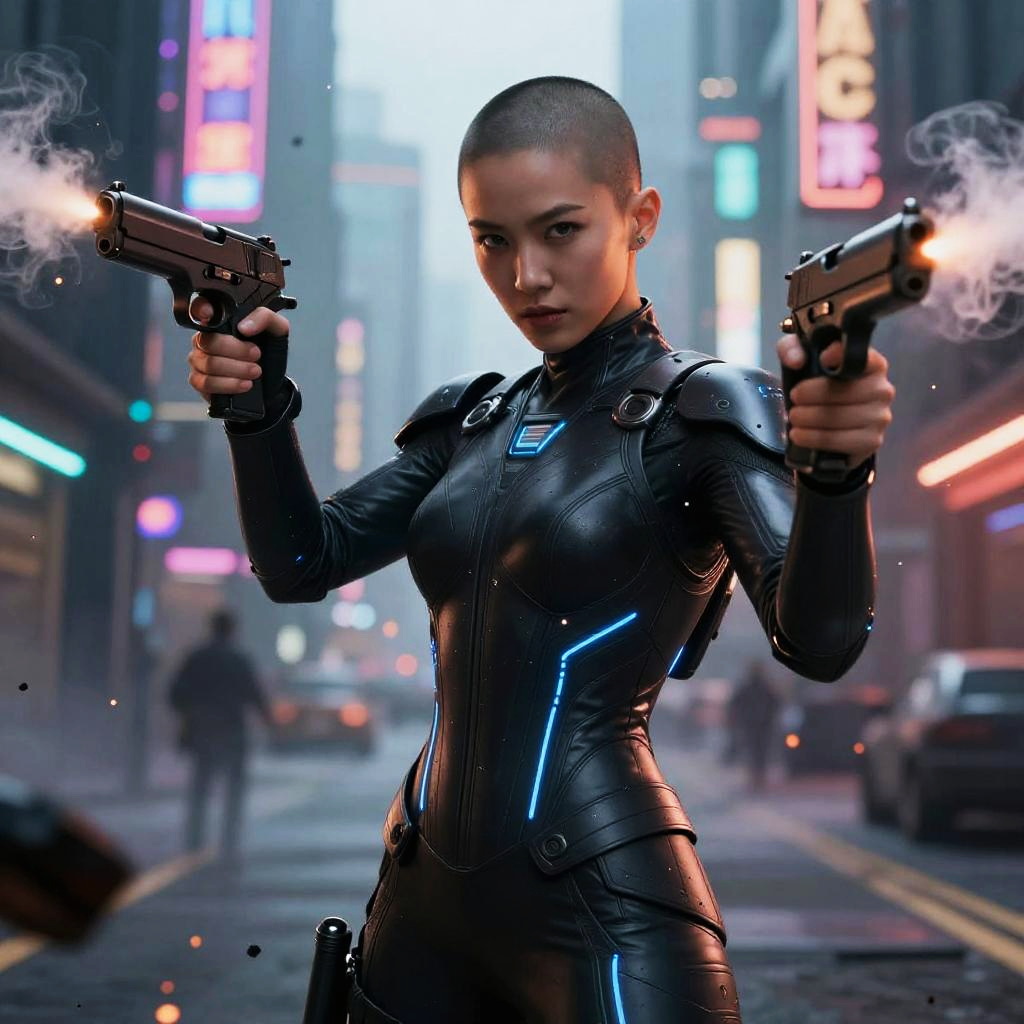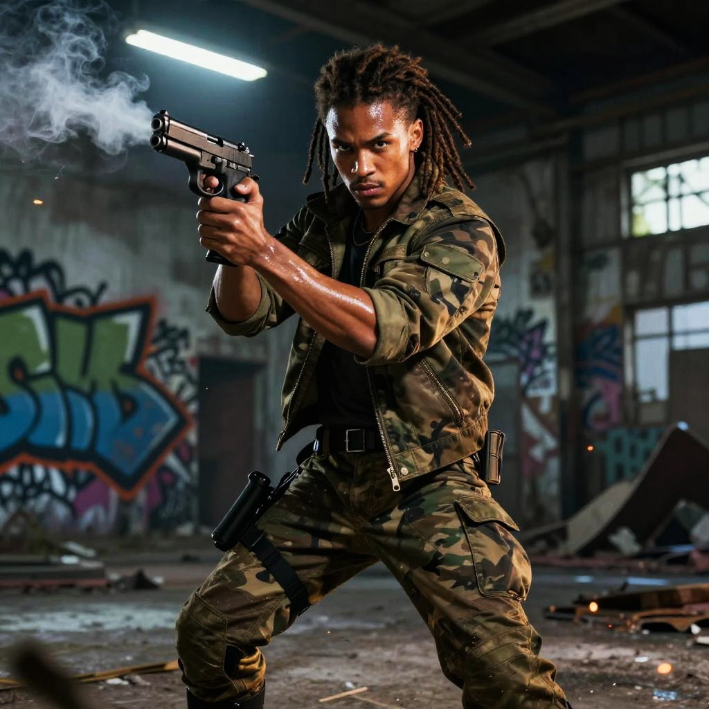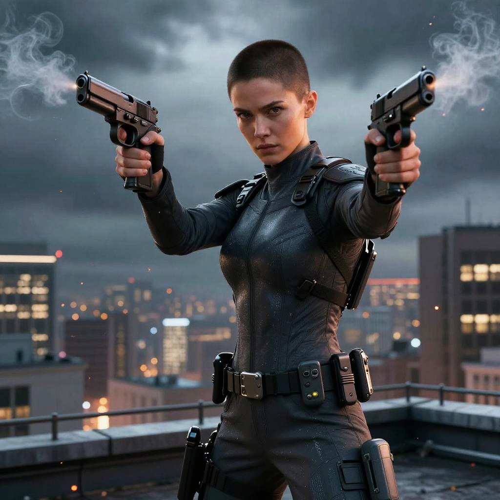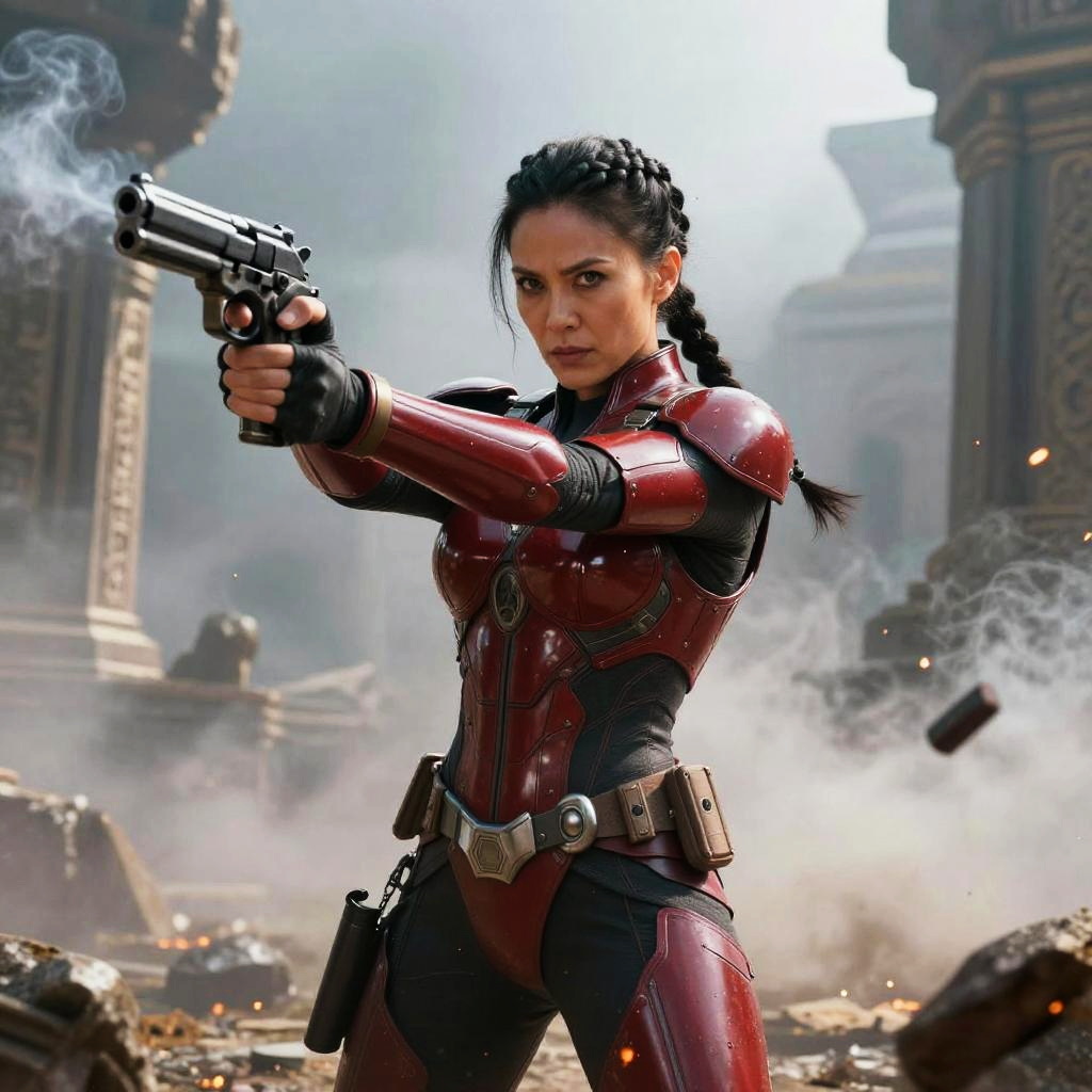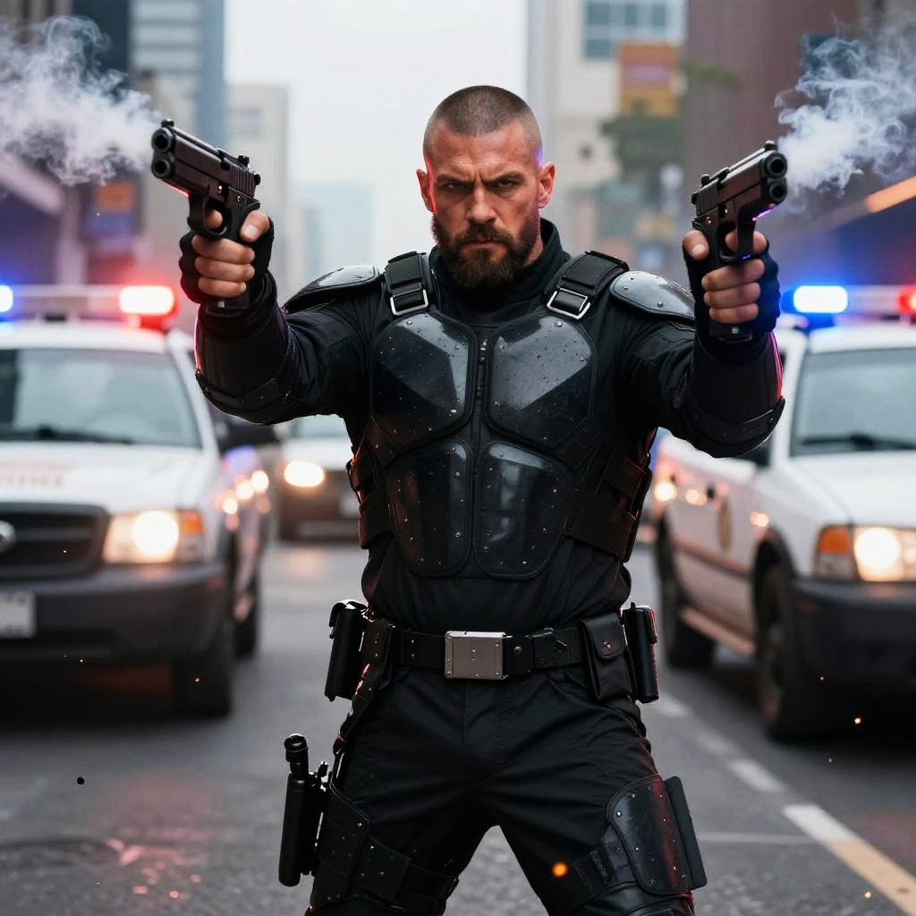 Photorealistic cinematic action still, SDXL: graceful young man with long golden hair tied back, wearing flowing white robes adorned with gold patterns, in ornate palace balcony overlooking sunlit cityscape. She locks eyes with the viewer, unwavering focus and power. Dual pistols raised, muzzle smoke, embers and flying debris. High detail, glossy highlights, skin pores, rim light, cool-warm contrast, volumetric fog, dynamic pose, crisp focus, dramatic tension.