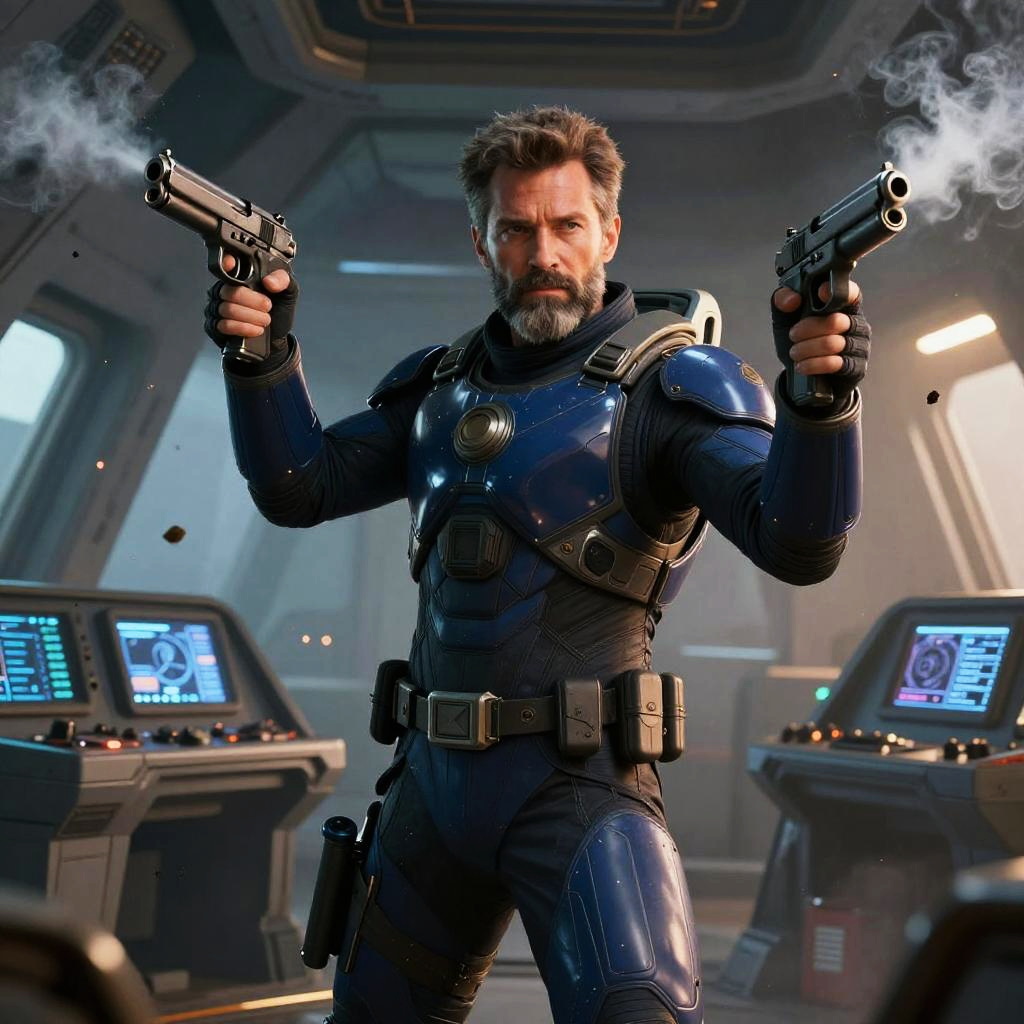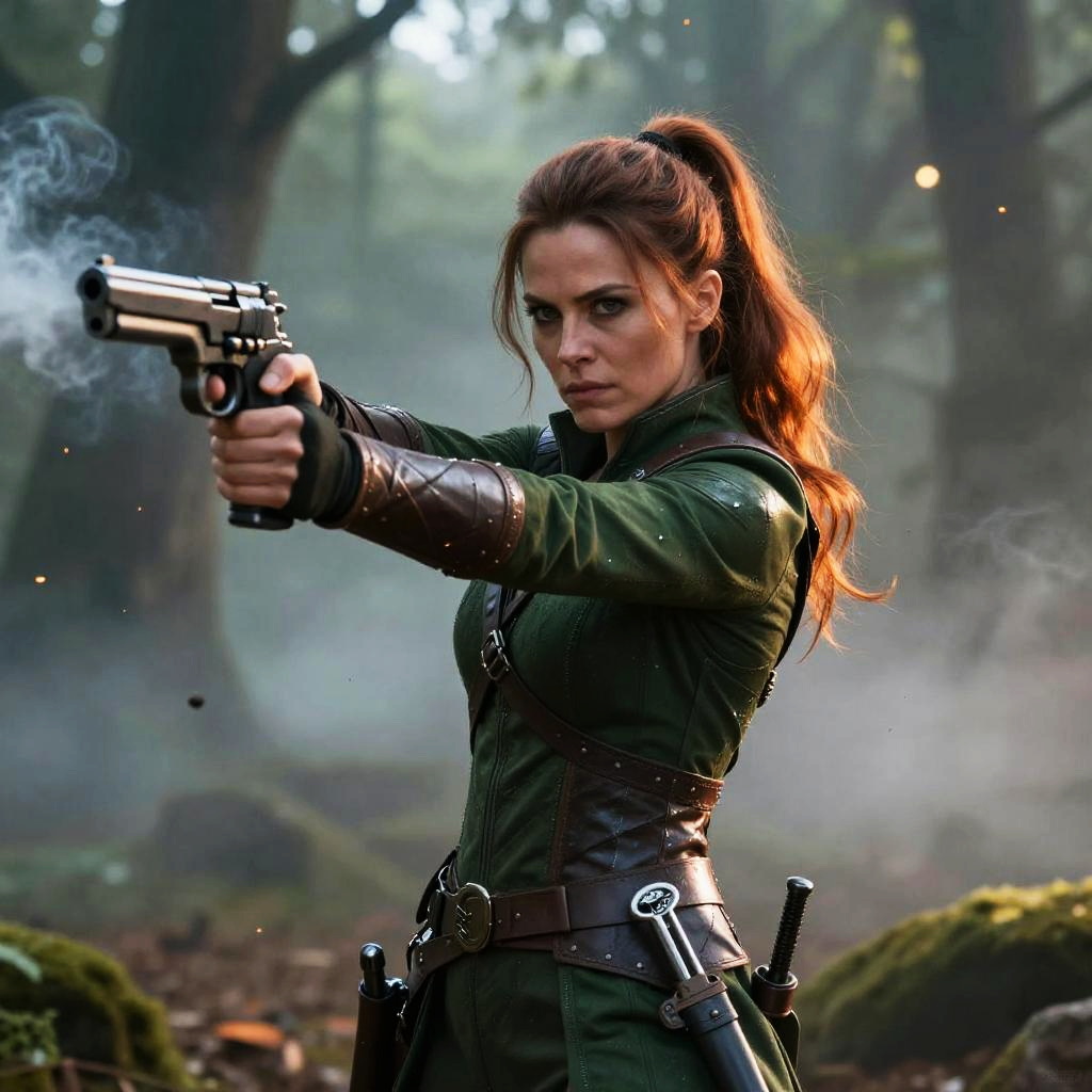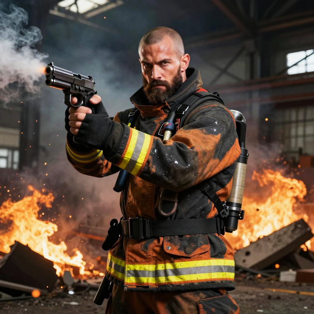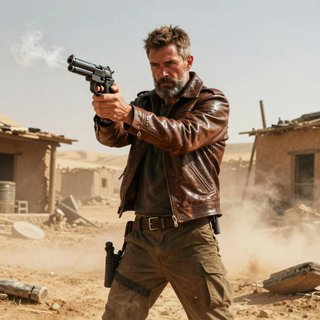 Photorealistic cinematic action still, SDXL: graceful young man with long golden hair tied back, wearing flowing white robes adorned with gold patterns, in ornate palace balcony overlooking sunlit cityscape. She locks eyes with the viewer, unwavering focus and power. Dual pistols raised, muzzle smoke, embers and flying debris. High detail, glossy highlights, skin pores, rim light, cool-warm contrast, volumetric fog, dynamic pose, crisp focus, dramatic tension.