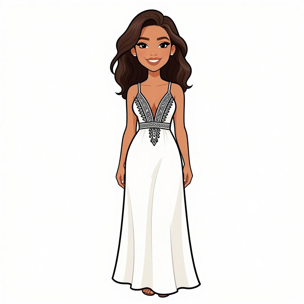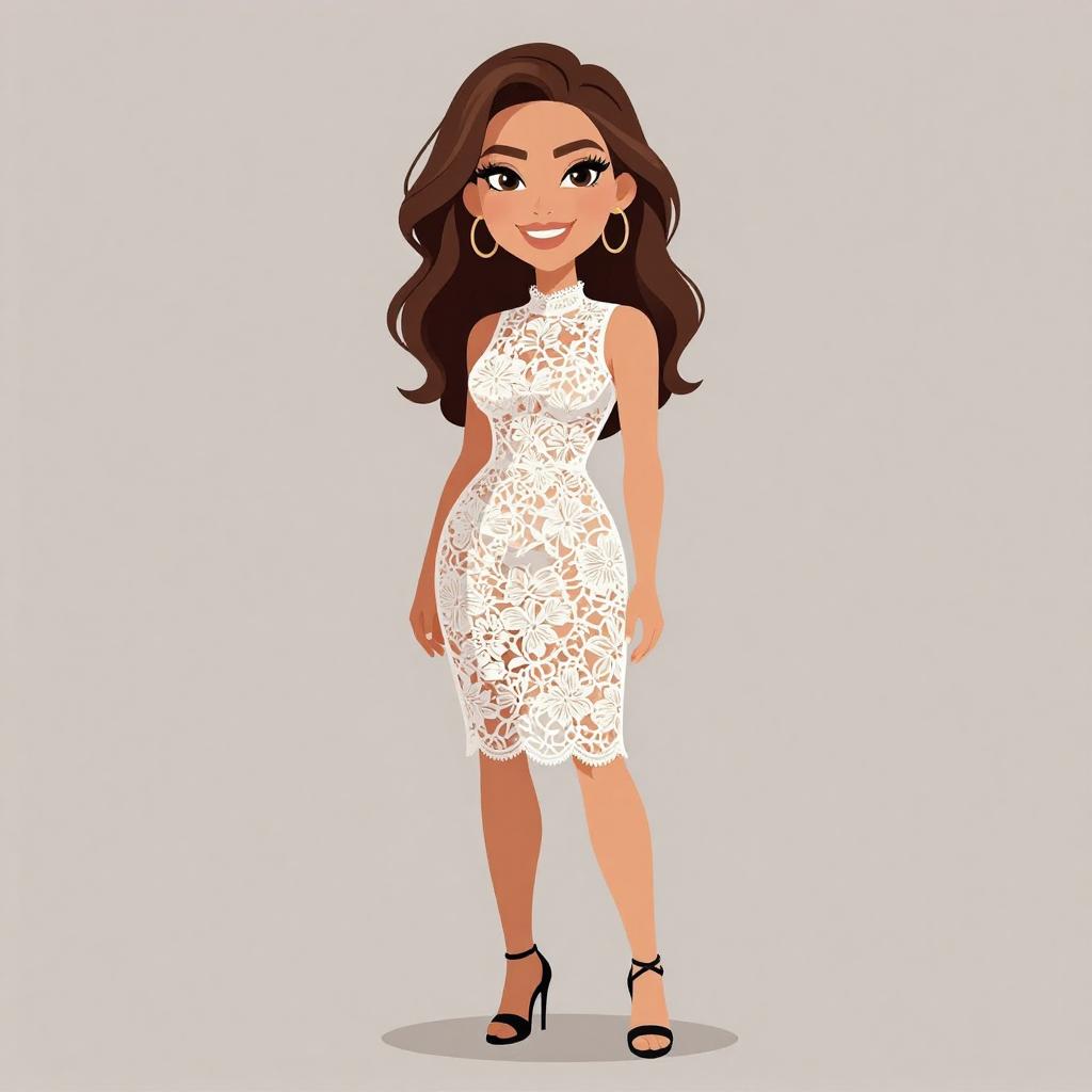 Woman with pretty face and pretty hair. smiling Woman, bohemian, strapless midi dress in white, eyelet lace detailing, scalloped hem, black gladiator sandals, chunky silver choker necklace, simple silver bangle, studio background with gray gradient. --sref 1467