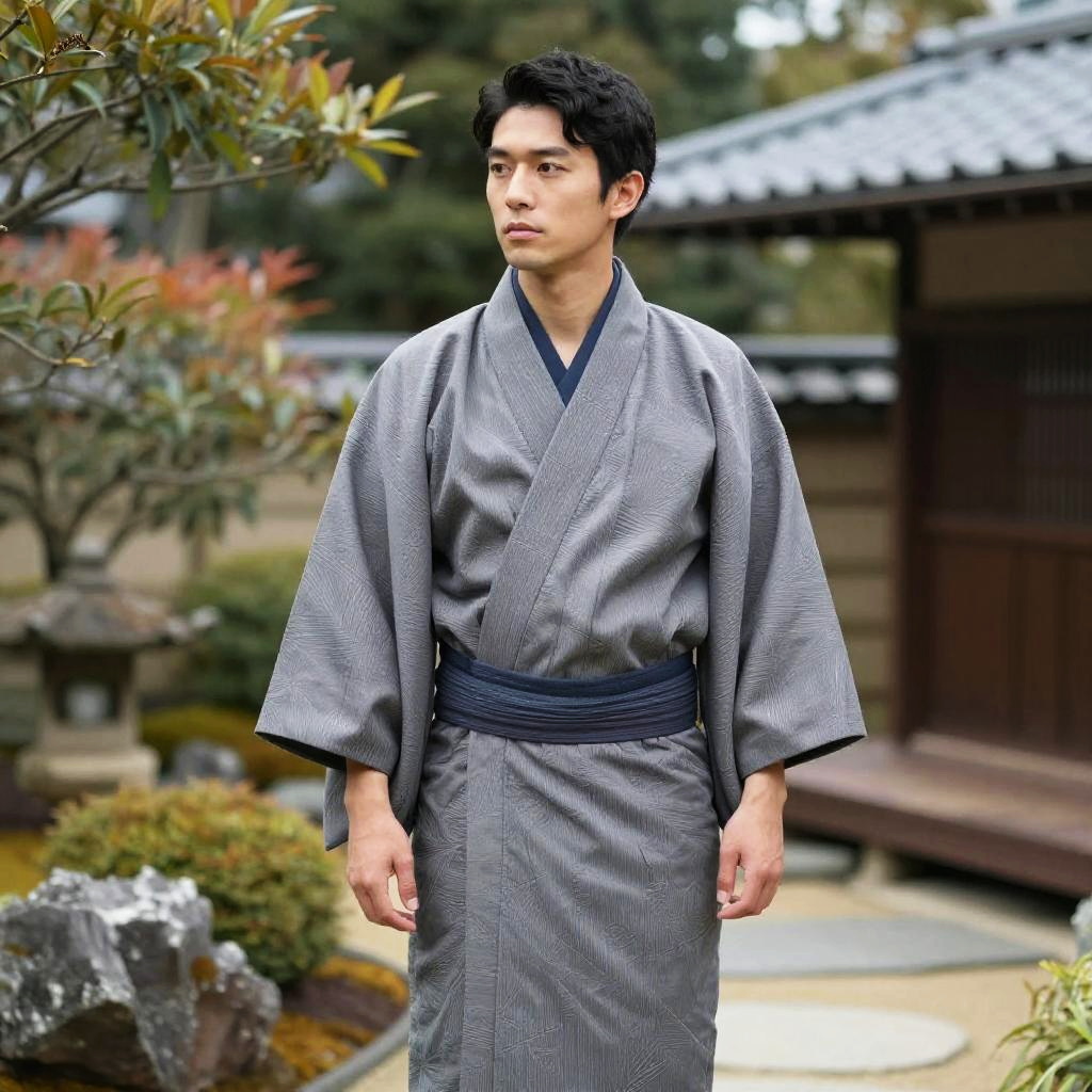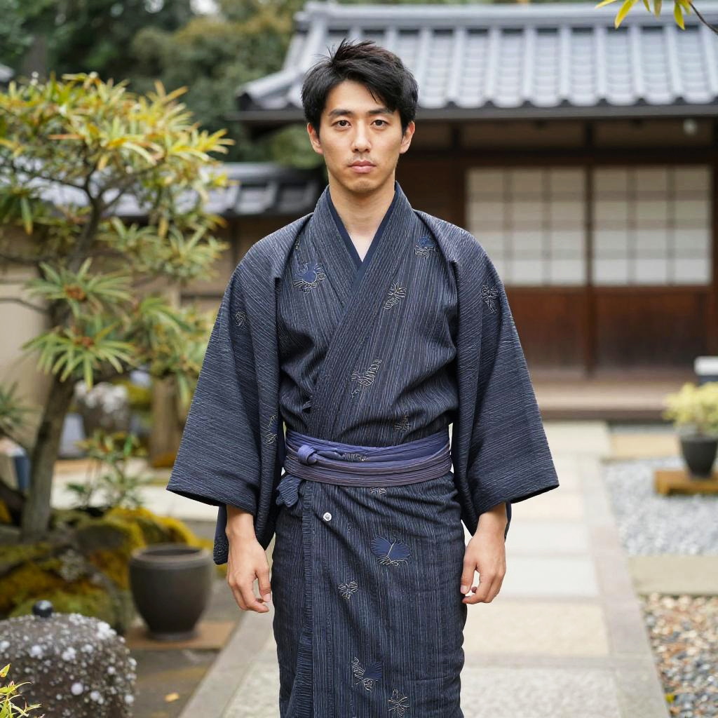 Portrait of an Asian man wearing a dark blue traditional Japanese kimono with a matching obi belt, standing in a serene Japanese garden with plants and traditional architecture in the background.