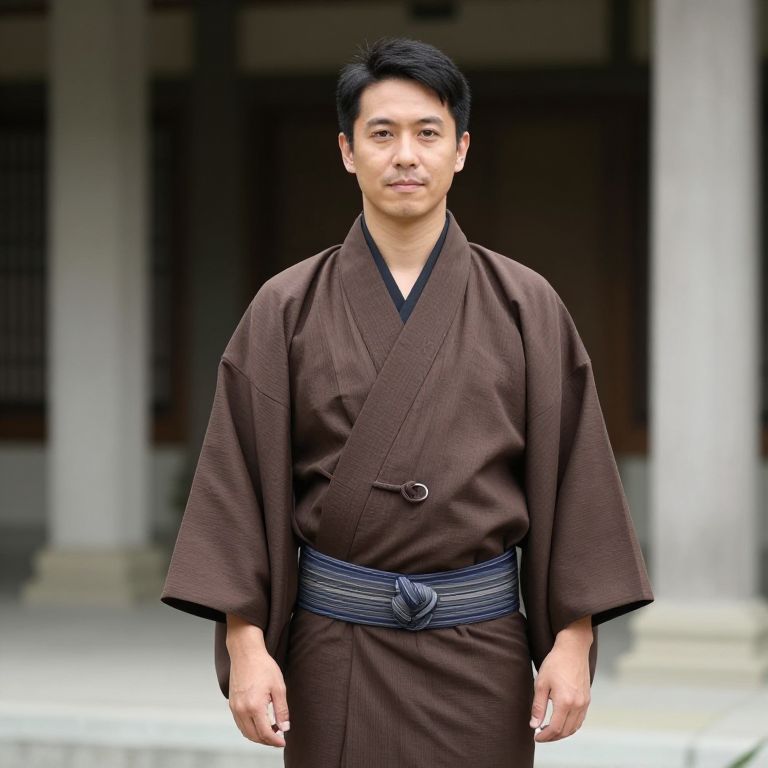 Male wearing a brown kimono with a belt around his waist. He is standing in front of a building with pillars.