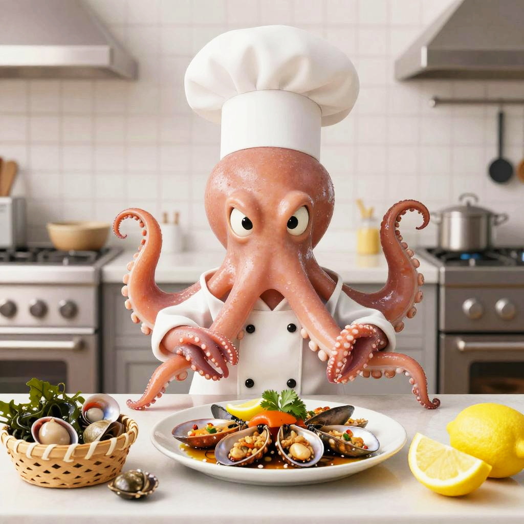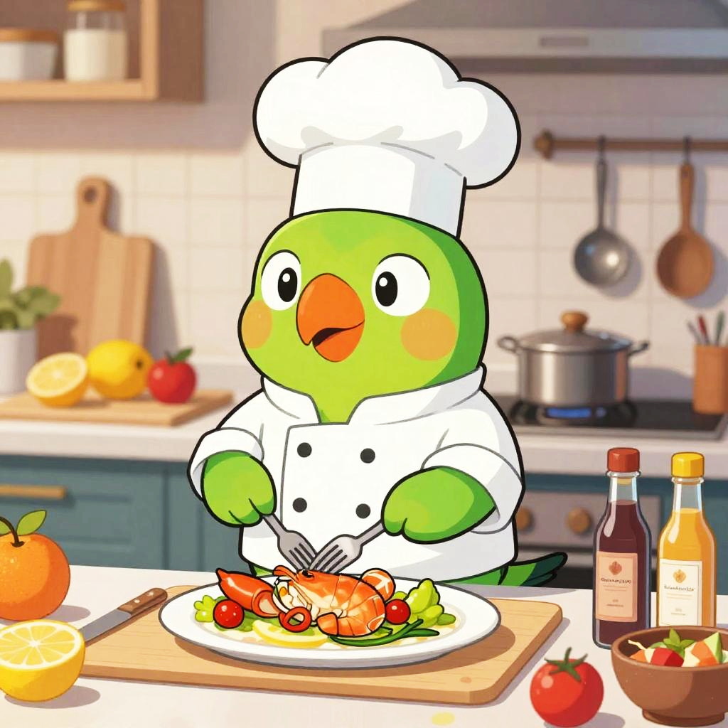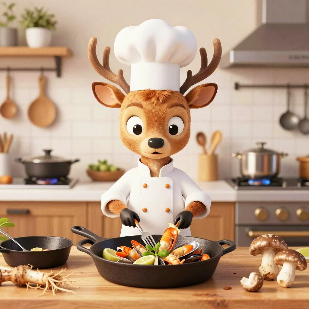 A cartoon goldfish wearing a chef’s jacket, standing in front of a kitchen counter with woks, sauces, and chopped scallions, mischievous expression, preparing a seafood dish, whimsical and fun design