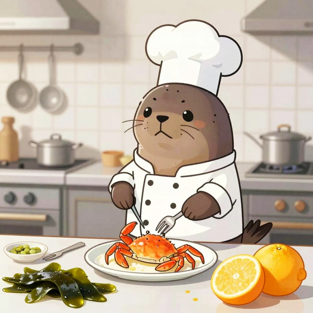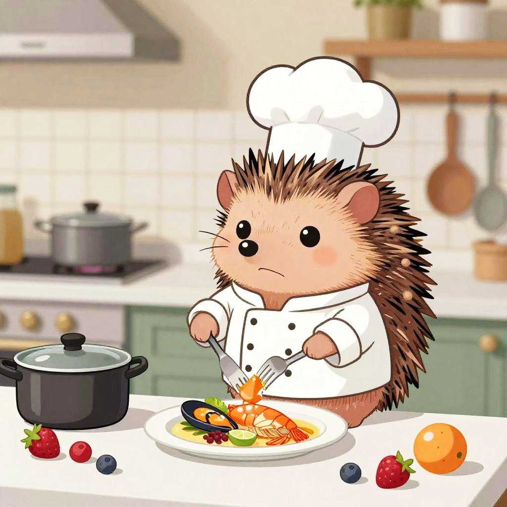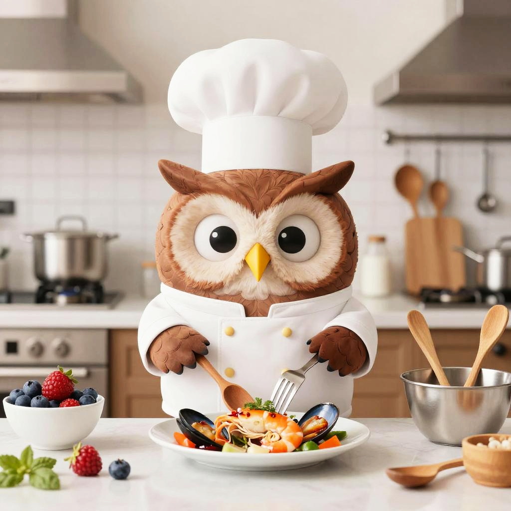 A cartoon goldfish wearing a chef’s jacket, standing in front of a kitchen counter with woks, sauces, and chopped scallions, mischievous expression, preparing a seafood dish, whimsical and fun design