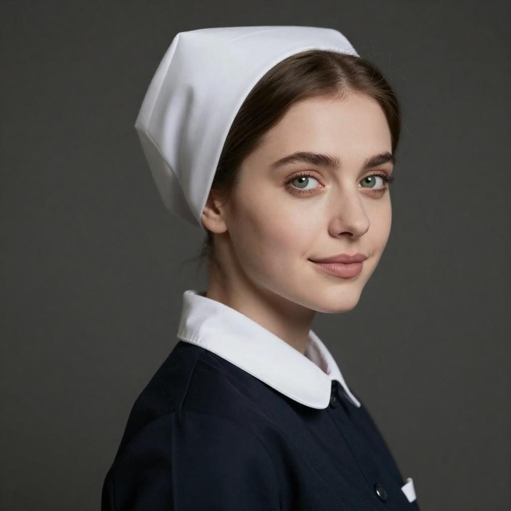 Photograph of a woman with fair skin, brown hair, and green eyes, wearing a white headscarf and dark nurse uniform. She is looking over her shoulder with a subtle smile. Dark, blurry background. Upper body portrait.