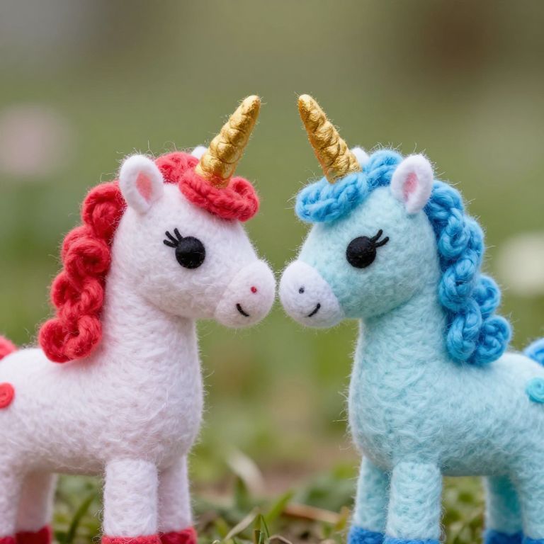 In a tender embrace of serenity, two felt unicorns stand nose-to-nose, their vibrant colors and golden horns symbolizing a magical connection that transcends the ordinary, evoking a sense of wonder and timeless companionship.