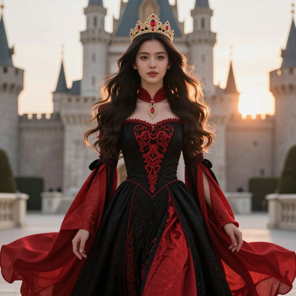 A realistically photographed woman in a detailed chess piece costume, wearing a queen chess piece outfit with a golden crown, red silk dress, and lace gloves, standing in a dimly lit medieval hall with stone walls, candlelight flickering, and chessboards scattered on the floor; her face is feminine, with soft brown eyes, fair skin, and a serene expression.. The woman has big tits and cute face