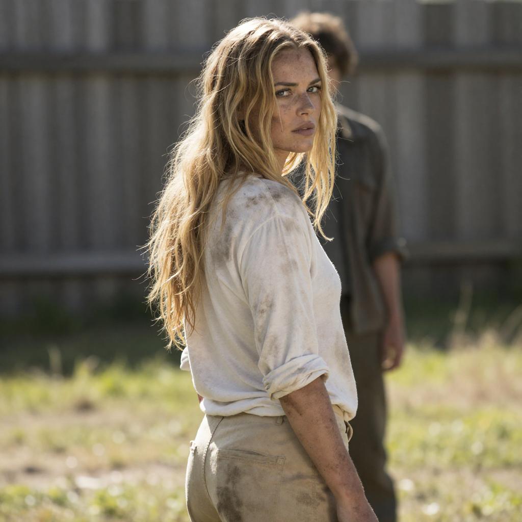 Photograph of a dirty, blonde-haired woman with long, unkempt hair, wearing a white, tattered shirt and beige pants, looking back with a serious expression. She is outdoors, in a sunlit, grassy area with a wooden fence in the background. Another person is partially visible behind her, blurred.