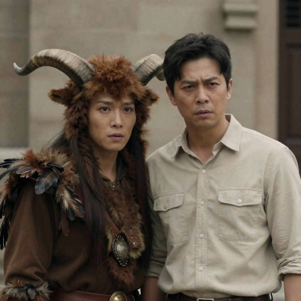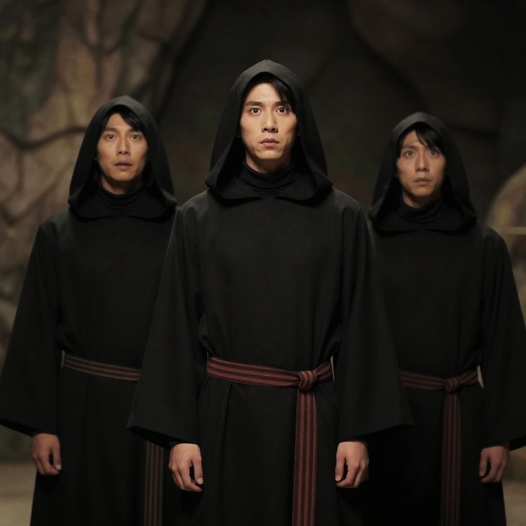 Three men in black hooded robes with wide-eyed expressions, standing in a dimly lit cave-like setting. They wear dark turtlenecks and striped belts. The background features a ured, rocky wall. The man in the center is tallest. The left and right men are slightly shorter.