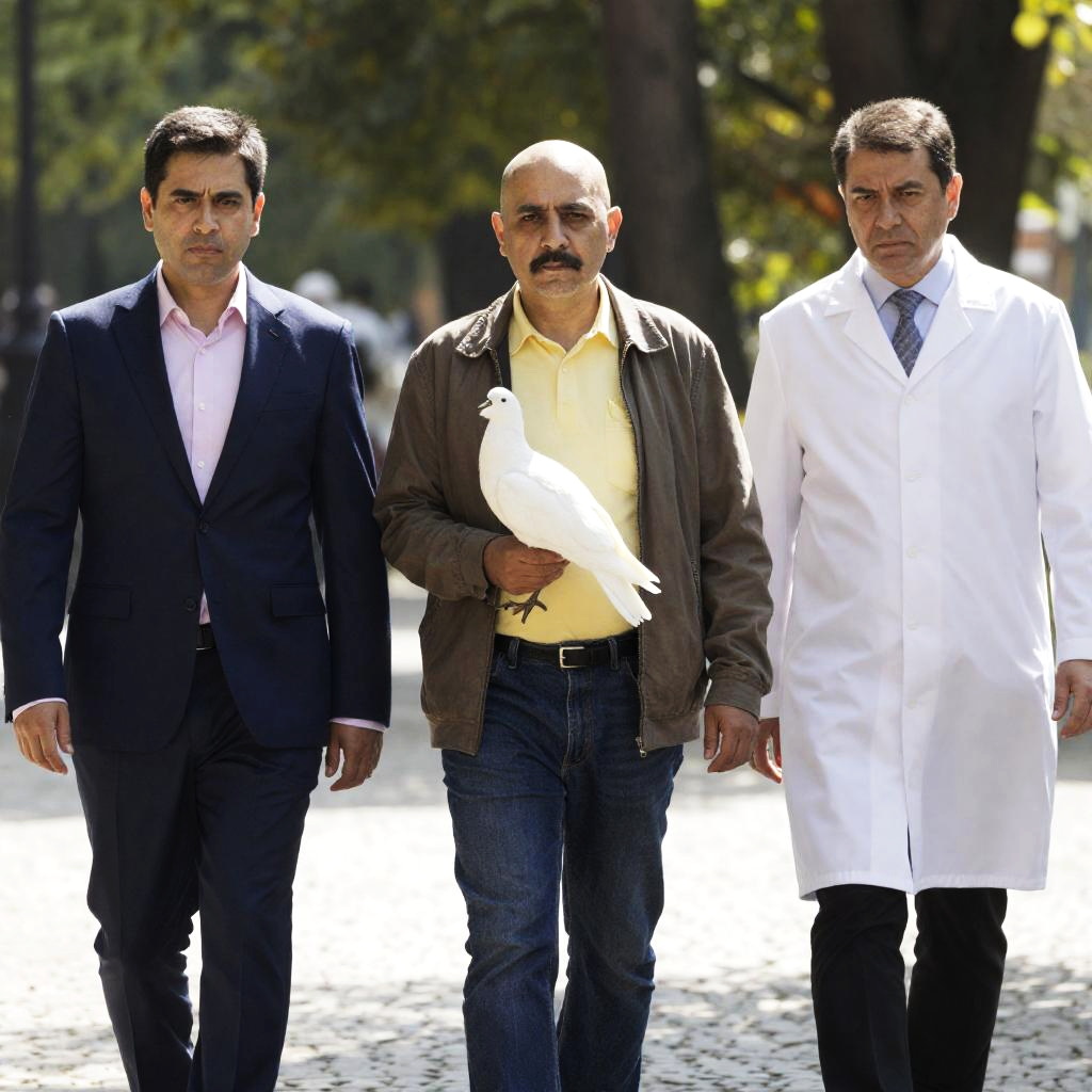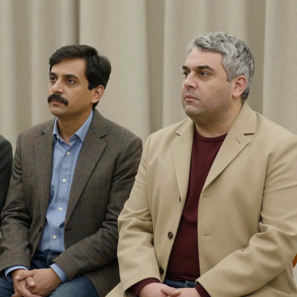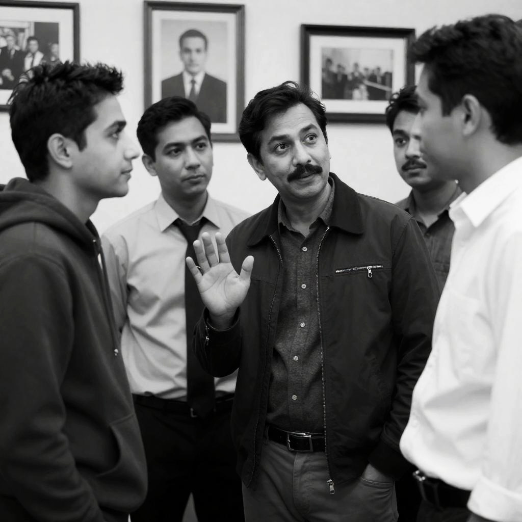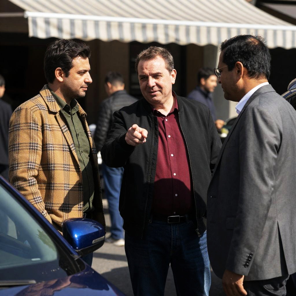 Photograph of three men standing near a blue car. Center man with short brown hair, black jacket, red shirt, pointing with right hand. Left man with dark hair, yellow plaid jacket, green shirt. Right man with dark hair, glasses, gray suit. Background: striped awning, other people, street. Sunlight casts shadows.