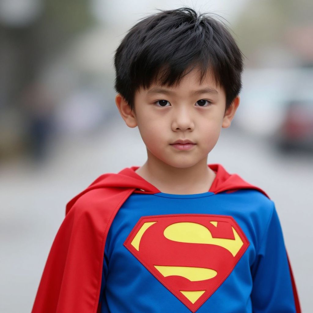 "kid superman costume, 1boy, male focus, solo, red cape, cape, realistic, black hair, blurry background, looking at viewer, blurry, superhero, outdoors Realistic photo of casual sexy person with pretty face"
