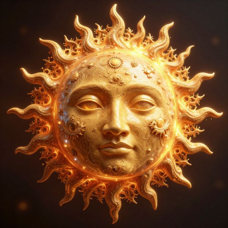Glowing, ornate sun mask with a human face, golden hues, intricate details, fiery rays, dark background, photograph.