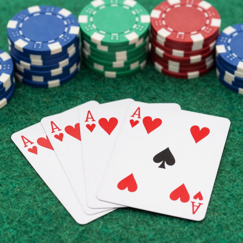 This is a colorful, close-up photograph of a poker game. A pair of hands with red-painted nails is resting on a green felt table, fingers spread over a row of poker chips in blue, green, and red. In front of the hands are five poker cards: a jack, queen, king, ace, and three of hearts. The background is dark, making the table and hands the main focus.