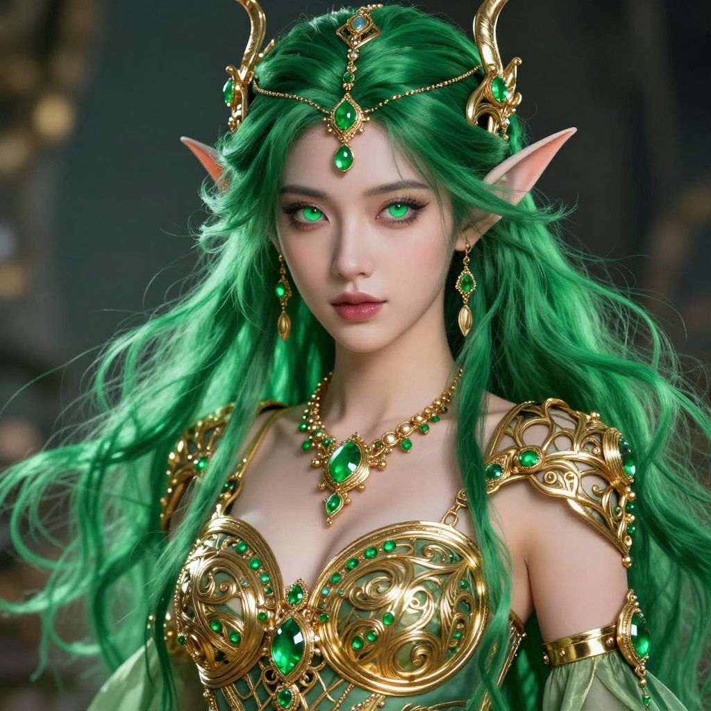 Digital fantasy artwork of a beautiful green-haired elf woman with glowing green eyes, wearing ornate gold and green armor, adorned with gemstones, set against