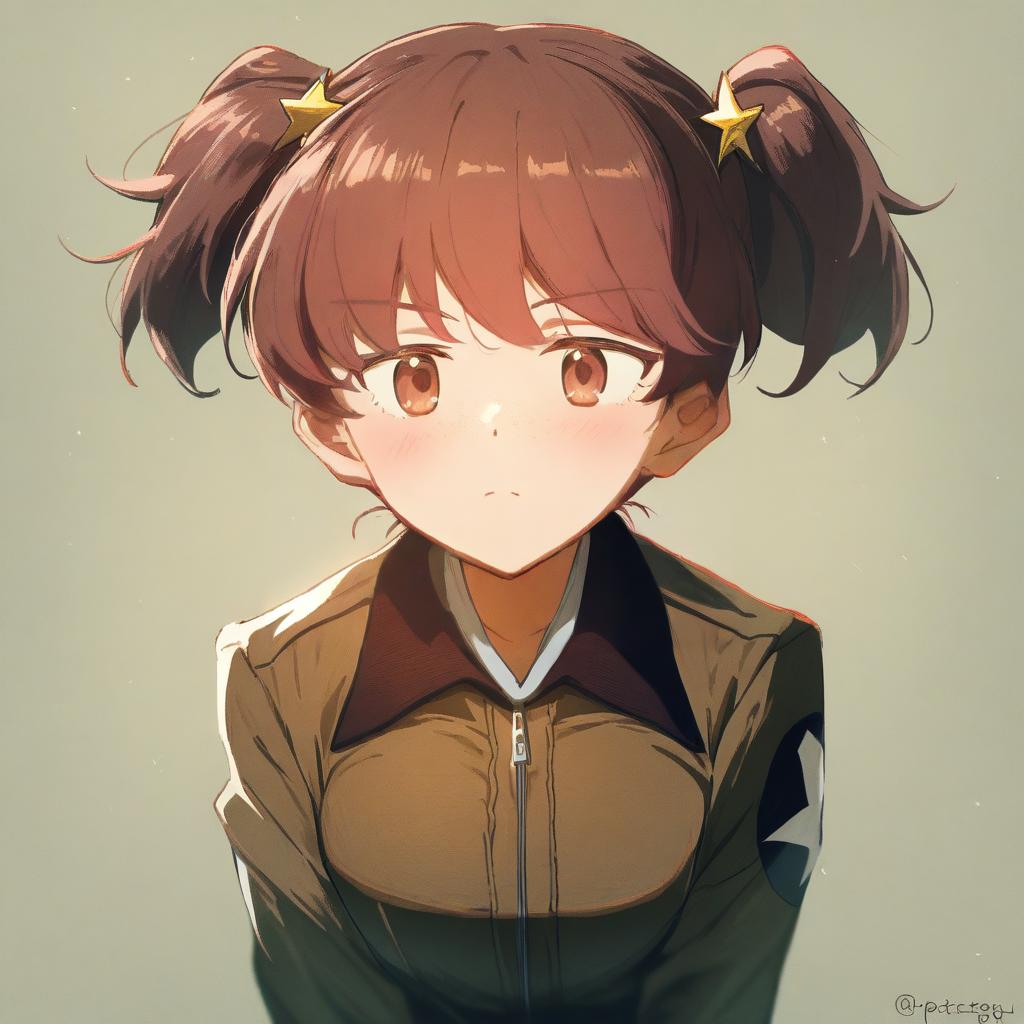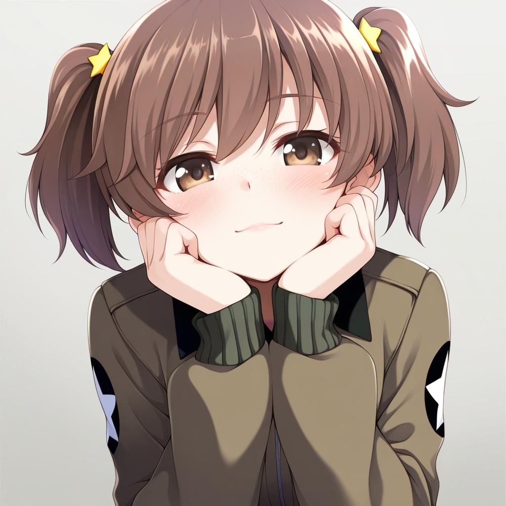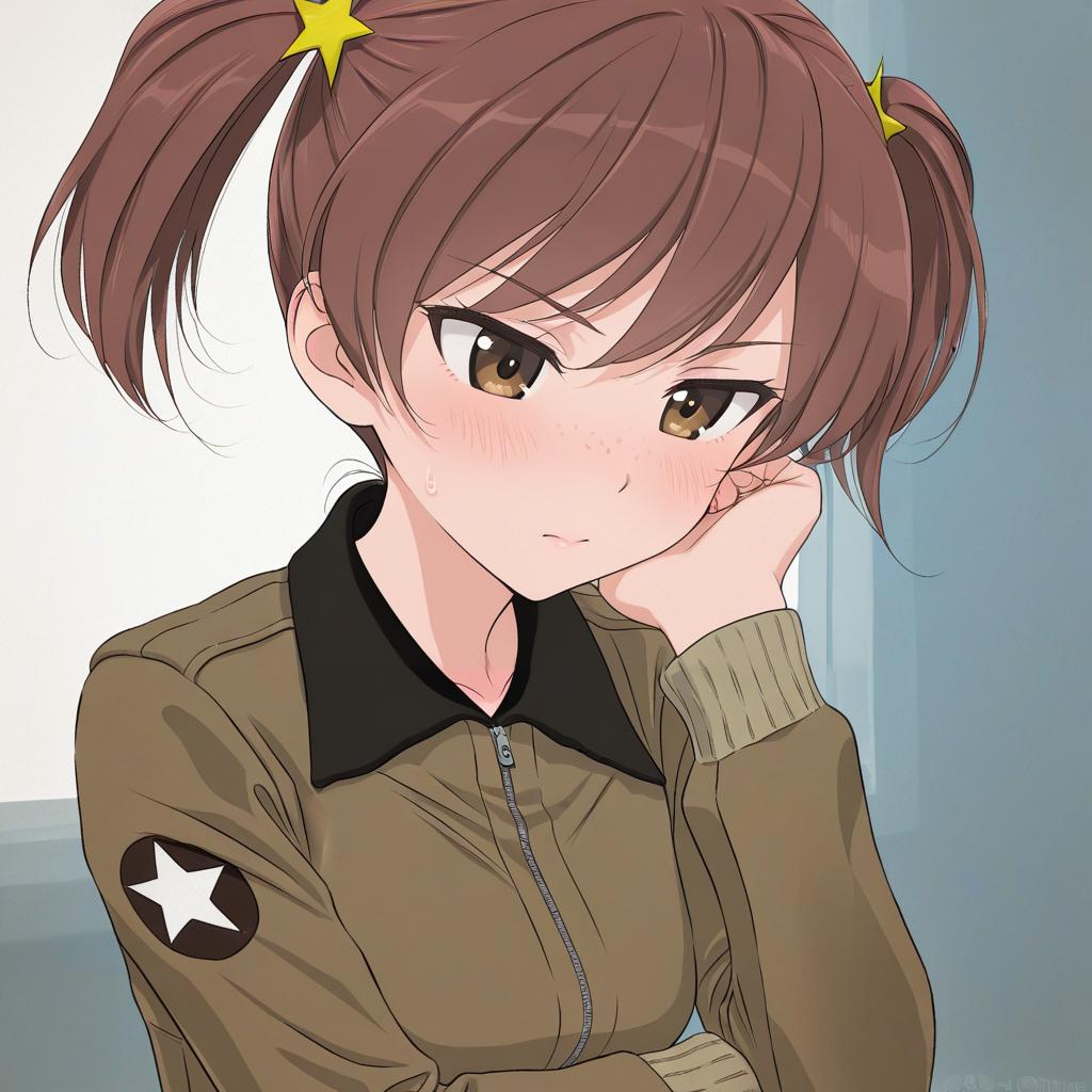 Alisa (girls und panzer), girls und panzer, 1girl, brown eyes, brown hair, short hair, star hair ornament, short twintails, freckles, saunders military uniform, long sleeves, by artist momose (oqo), animagine