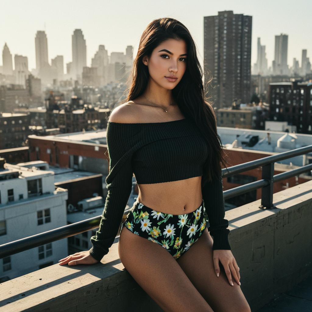 Woman wearing slouchy off-the-shoulder ribbed knit crop top and low-rise floral bikini bottoms in black ribbed top with neon print bottoms on tan-skinned woman with messy high ponytail posed standing side-on with one hand on the railing and the other on her hip in city rooftop with low walls and scattered buildings beyond, soft late-afternoon sunlight with gentle glow, sunny lifestyle fashion photography, high resolution, ultra-detailed
