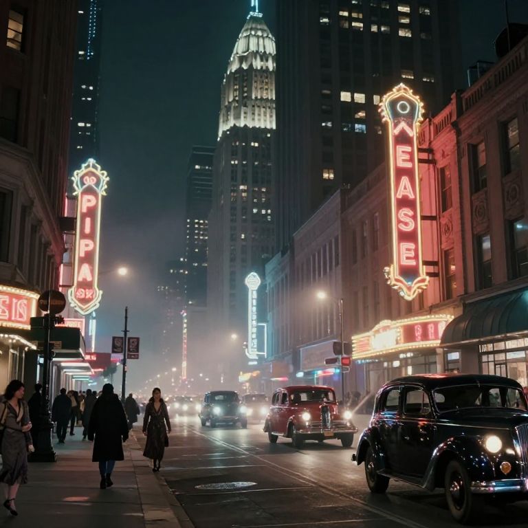 Twenties cityscape at night, busy urban street with glowing neon signs, old-fashioned cars, people wearing 1920s style clothing, foggy atmosphere, art deco skyscrapers, moody cinematic lighting