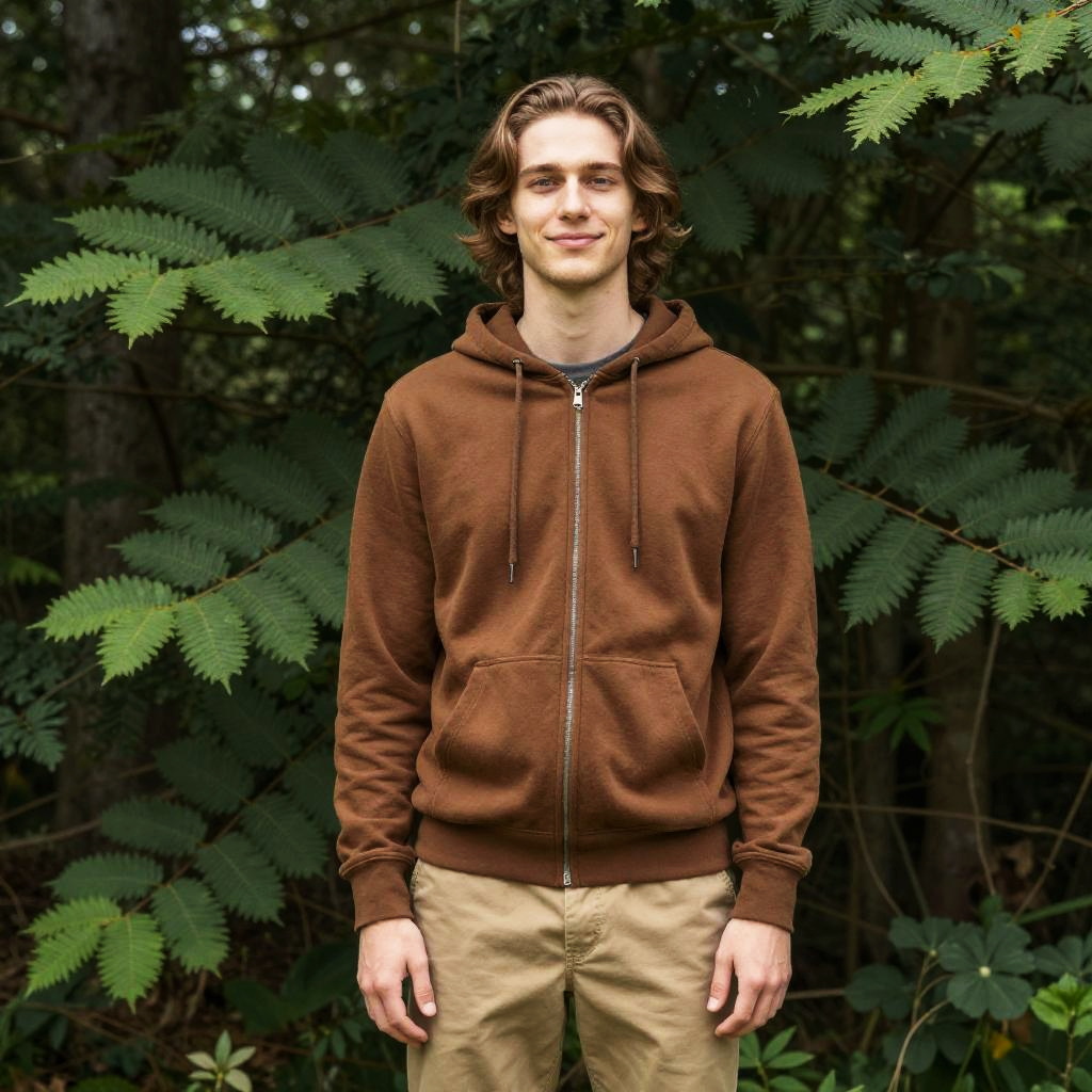 A young man stands confidently in an outdoor forest setting, surrounded by lush green foliage. He is casually dressed in a brown zip-up hoodie and khaki pants, with a relaxed smile and shoulder-length hair.