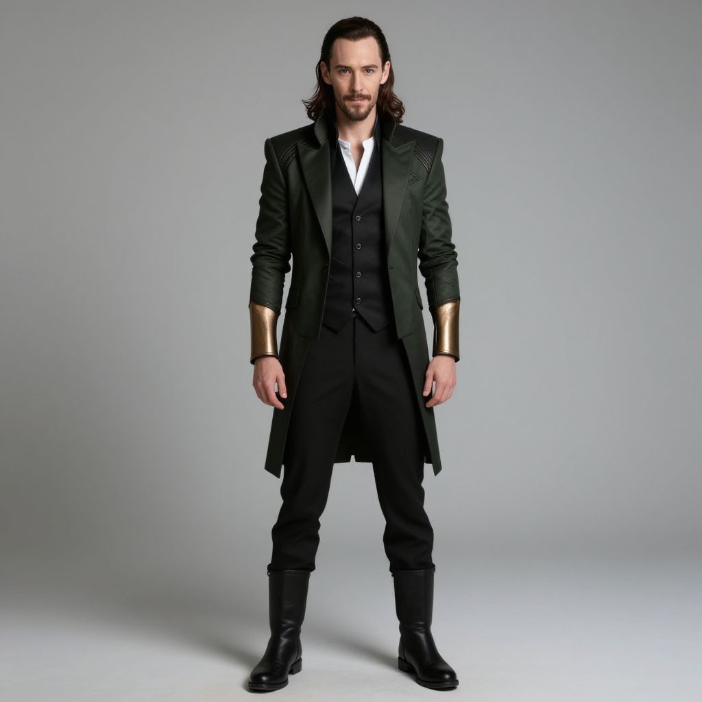 Photograph of a young man with short brown hair, wearing a red coat with black collar, black vest, white shirt, and red pants, against