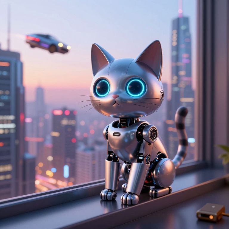 CGI image of a shiny, silver robotic cat with large, glowing blue eyes, sitting on a windowsill. The cat has a cute, round face and is made of metal with visible joints and seams. In the background, a cityscape at sunset is visible, with tall buildings and a flying car. The window reflects the colorful lights of the city. A small, black smartphone lies on the windowsill to the right. The overall style is futuristic and whimsical, with a blend of vibrant and cool colors.