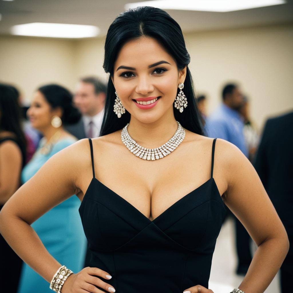 Twin fancy dress,1girl, solo, dress, realistic, pink dress, jewelry, necklace, earrings, breasts, black hair, cleavage
